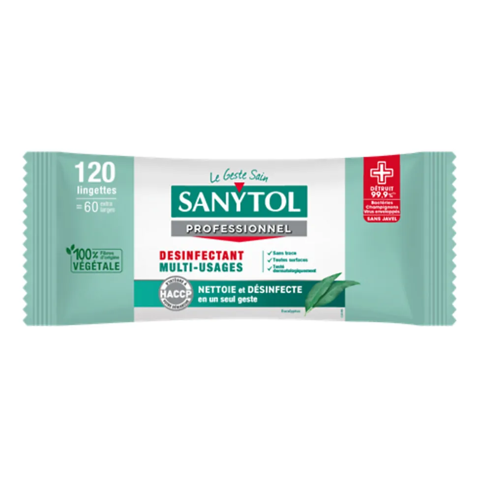 Sanytol – Lingettes désinfectantes multi-usages eucalyptus (120 unités, 0,2 L) Offrez à votre intérieur une propreté irréprochable avec ces lingettes désinfectantes Sanytol, idéales pour nettoyer et désinfecter toutes les surfaces lavables sans javel. Efficaces contre 99,9 % des bactéries, virus et champignons, elles sont testées dermatologiquement, garantissant une utilisation sûre pour toute la famille. Leur parfum eucalyptus laisse une sensation de fraîcheur agréable après chaque utilisation. Prêtes à l’emploi, ces lingettes sont parfaites pour entretenir le plan de travail, le réfrigérateur, les WC, les poignées de porte, les interrupteurs, les poubelles ou encore l’univers de bébé. Chaque paquet contient 120 lingettes jetables, offrant une solution pratique et efficace pour un ménage quotidien. Produit biocide – respecter les précautions d’emploi.