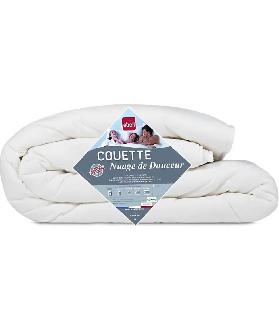 ABEIL Couette légere NUAGE de DOUCEUR en microfibre 100% Polyester de coloris blanc. Garnissage : 60% polyester Cyclafill et 40% polyester Airfill. Grammage : 200 gr/m². Piquage : parfil simple. Finition : ganse blanche. Packaging : sachet simple soudé + Encart Abeil. Fabrication Française. Dimensions : 200×200 cm.