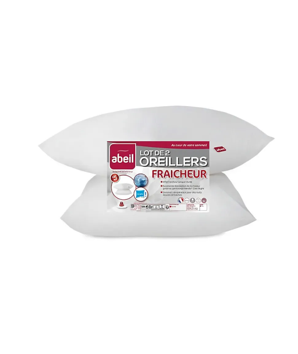 Le lot de 2 oreillers Aerelle Cool Night 60×60 cm ABEIL offre un soutien cervical ajustable grâce à son garnissage en fibres polyester haute résilience. Technologie Cool Night avec fibres creuses pour une aération optimale, enveloppe en coton Oeko-Tex Standard 100, lavable en machine à 40°C.
