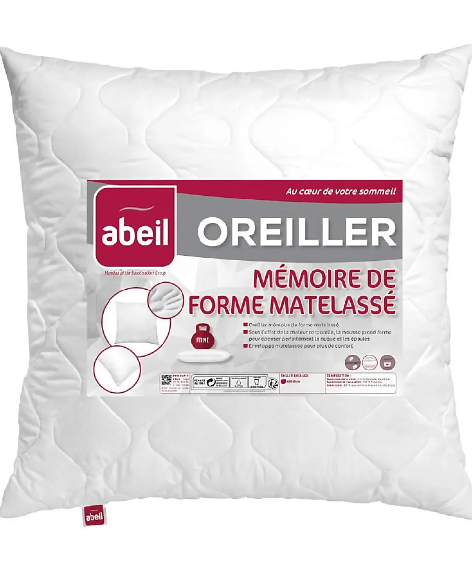Oreiller a mémoire de forme matelassé en microfibre 100% polyester de coloris blanc. Garnissage : flocons de mousse viscoélastique polyuréthane mémoire de forme. Grammage : 950 gr/m². Packaging : housse zippée cristal + encart. Dimensions : 60×60 cm.