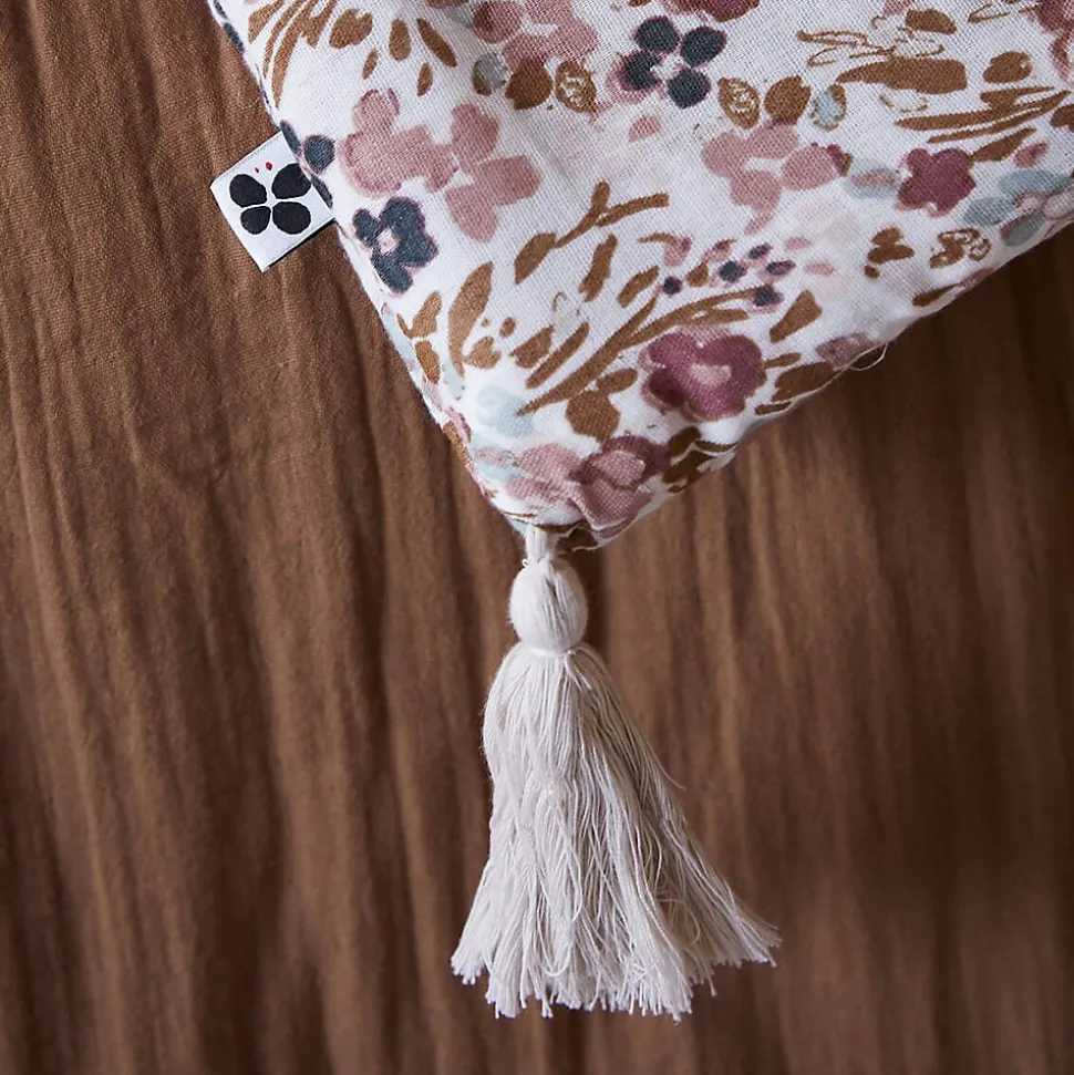 - Fabrication 100% Coton, densité 125g/m2. Garnissage 100% Polyester, densité 300 g/m2. Capitonnage léger. Finition avec pompon aux 4 coins. Produit certifié OEKO-TEX.