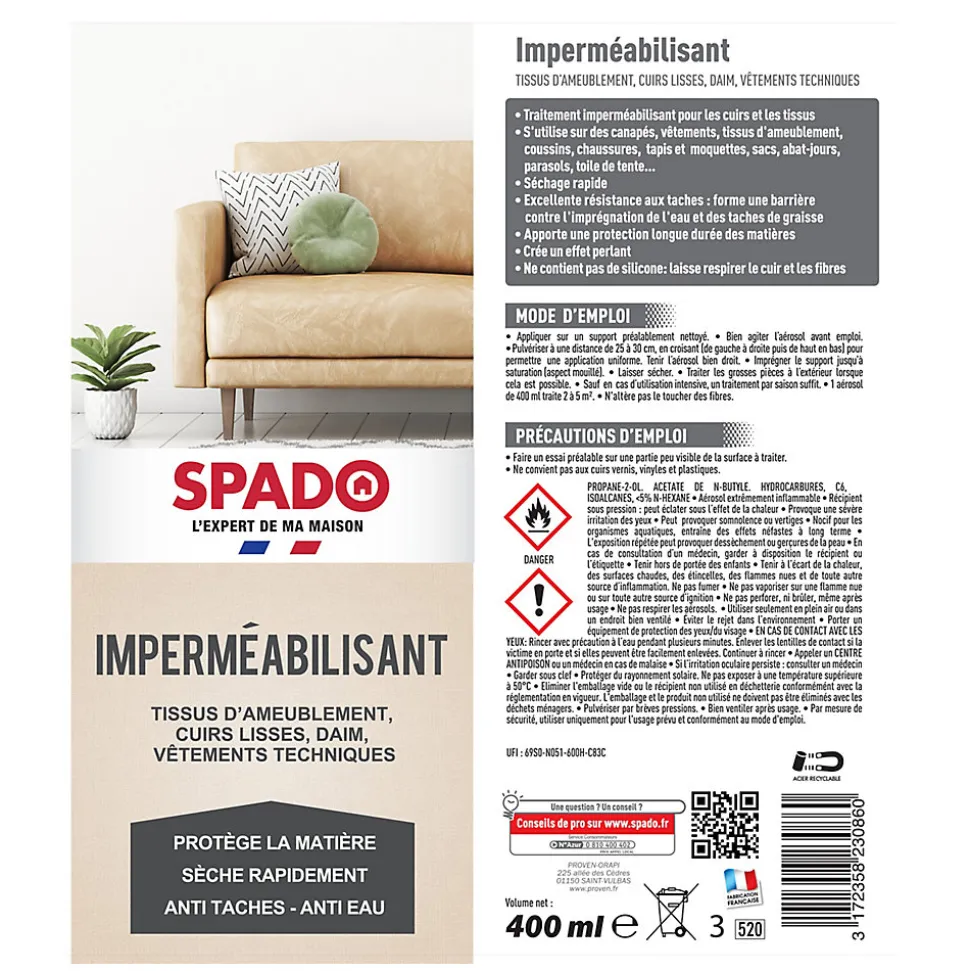 Traitement imperméabilisant pour les cuirs et les tissus.S’utilise sur des canapés, vêtements, tissus d’ameublement, coussins, chaussures, tapis et moquettes, sacs, abat-jours, parasols, toile de tente…Excellence résistance une barrière contre l’imprégnation de l’eau et des taches de graisse.Crée un effet perlant.Ne contient pas de silicone : laisse respirer le cuir et les fibresSèche rapidementProtège la matière