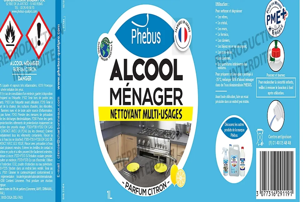 Alcool ménager nettoyant multi-usages Phebus parfum citron 1L