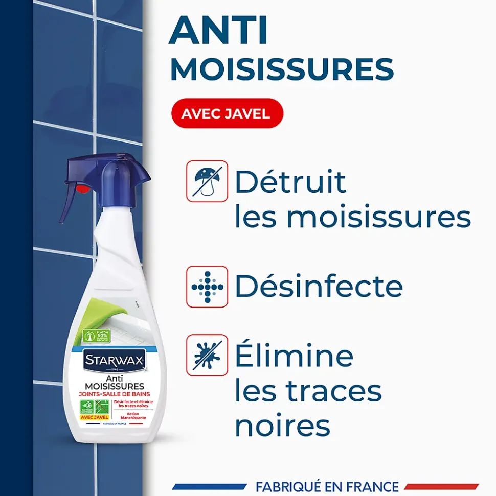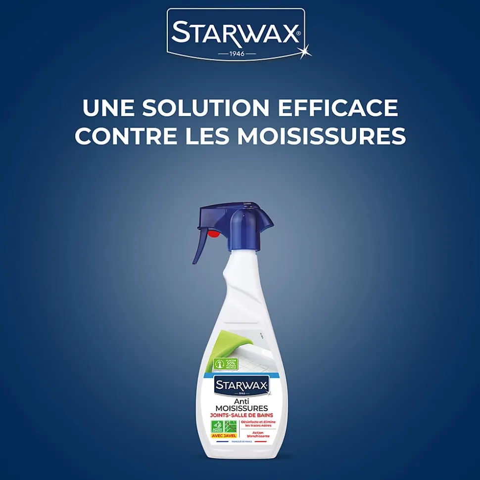 Avec l’anti-moisissures Idéal joints Starwax 500 ml vous allez être séduit par l’efficacité de l’anti-moisissures Starwax : Après pulvérisation et une action de quelques minutes, il détruit les moisissures, élimine les traces noires et désinfecte le support. Grace à sa Formule préventive, il empêchera aussi le développement des bactéries. Appliquer sur les joints (de carrelage ou de silicone), les rideaux de douche,… dans les pièces d’eau ou mal aérées.