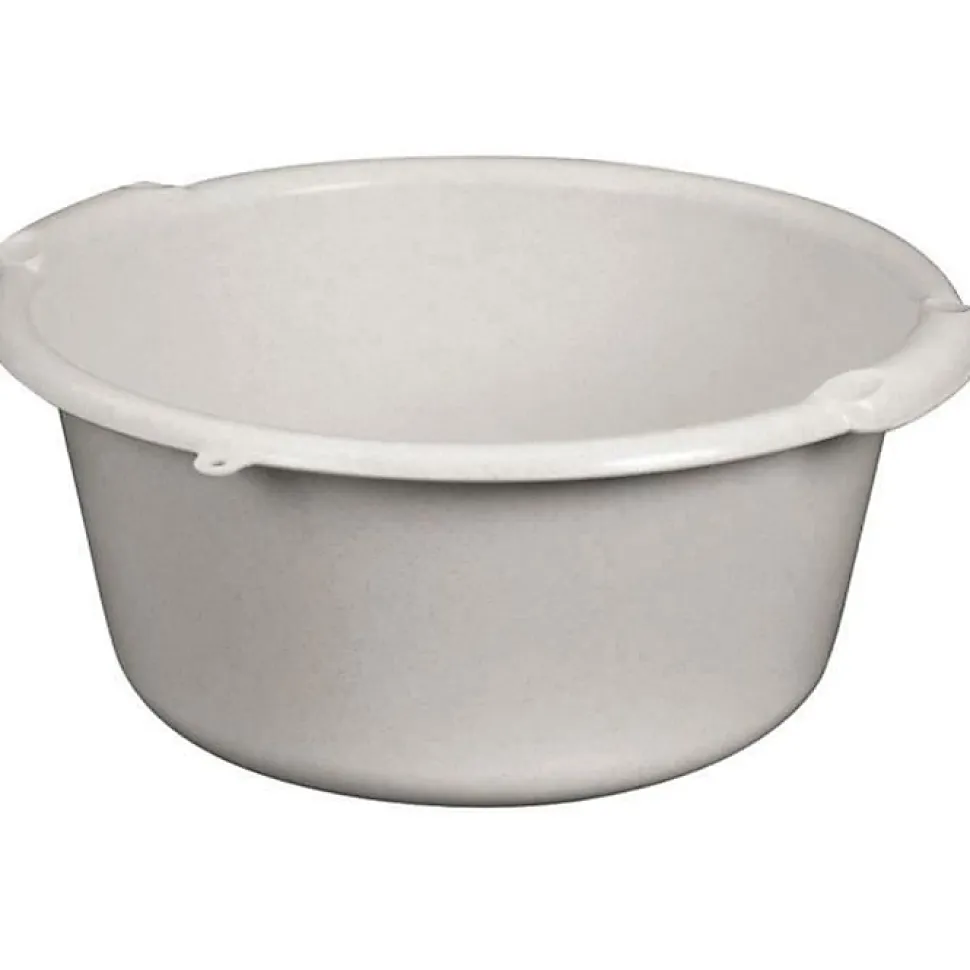Bassine ronde 14 L (Ø 42 × H 17 cm) en plastique gris moucheté, dotée de deux poignées intégrées et de parois coniques empilables pour un rangement facile ; idéale pour les usages ménagers et le nettoyage. Réf. 653675.