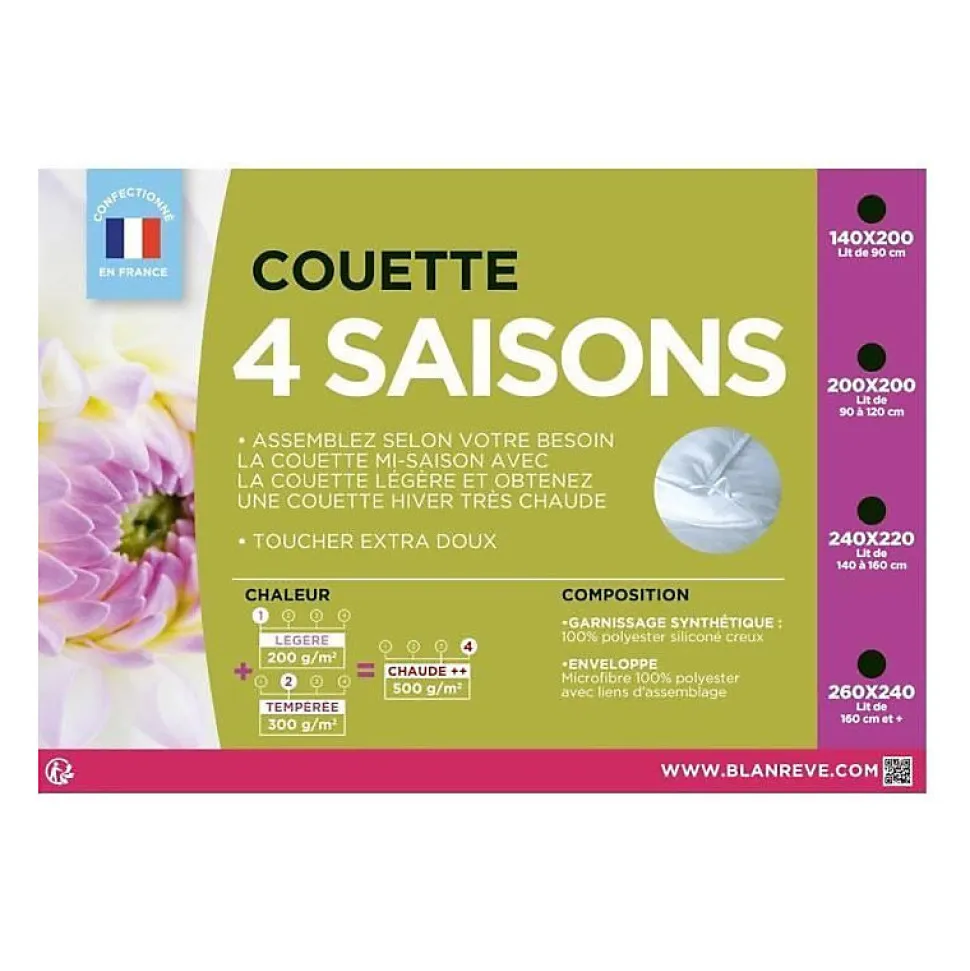 La couette 4 saisons BLANREVE allie confort et adaptabilité pour toutes les saisons grâce à son garnissage en polyester siliconé creux et son enveloppe en microfibre doux au toucher, idéale pour un sommeil paisible et réparateur toute l’année.