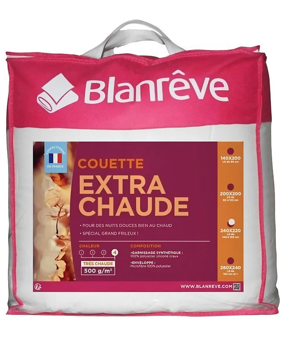 Couette extra chaude en microfibre – 220 x 240 cm – Enveloppe : microfibre 100% polyester – Garnissage : 100% polyester fibre creuse siliconée 500g/m² – Piquage Longiligne – Finition Biais – Coloris : blanc – Livrée dans une valise.