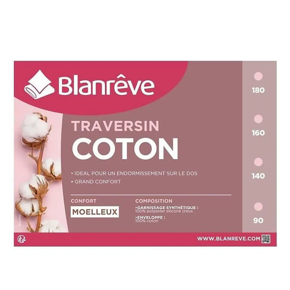 Traversin en coton – 160 cm – Enveloppe : 100% coton 30×27 fils/cm2 – Garnissage : 100% polyester fibre creuse siliconée 1200 g – Confort moelleux – Coloris : blanc – Livré dans un sachet et encart.