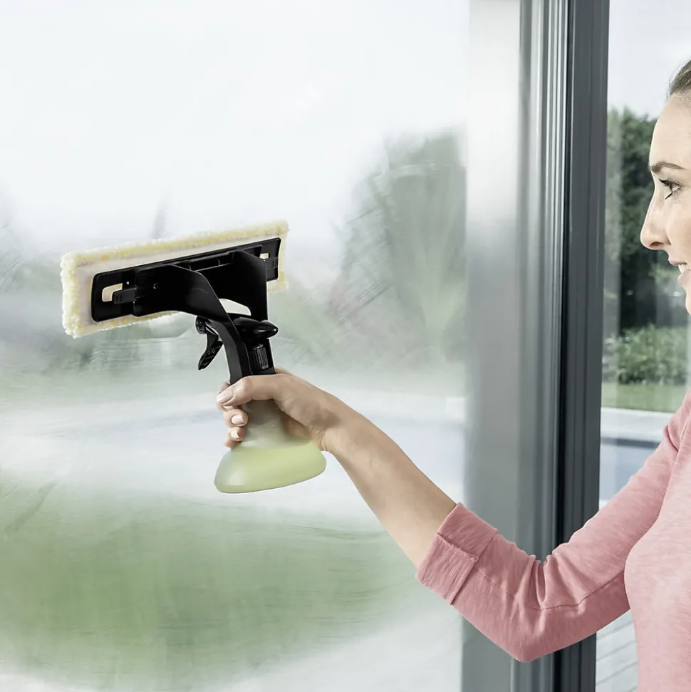La bonnette en microfibre pour usage en intérieur, dotée d’une fixation auto-agrippante, permet un nettoyage optimal des saletés sur toutes les surfaces lisses avec le pulvérisateur du nettoyeur de vitres.
