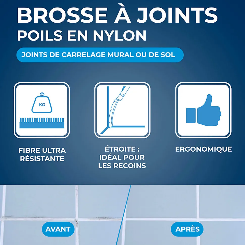 Récure efficacement les joints, les recoins et les angles grâce à sa tête étroite. Poignée ergonomique et anti-dérapante pour une bonne prise en main. Ne rouille pas.
