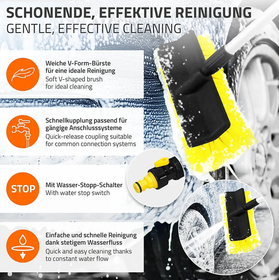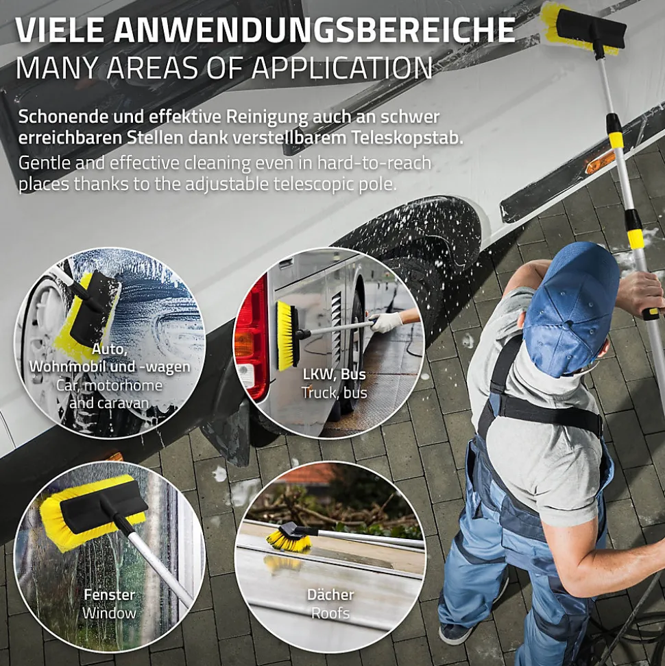 Voici à quoi doit ressembler une brosse de lavage professionnelle. Cette brosse avec un manche télescopique de 130 à 300 cm et une alimentation en eau est l’outil parfait pour nettoyer la voiture sans effort. Grâce à un contrôleur de débit et un interrupteur marche/arrêt, vous pouvez également contrôler entièrement la consommation d’eau. Son poids plume de moins d’un kilo et ses poignées en EVA antidérapant font du lavage de voiture un jeu d’enfant. Grâce aux poils en nylon doux de la brosse de lavage, la peinture est également complètement épargnée. La brosse de lavage a également une résistance accrue aux produits de nettoyage. La brosse de lavage pour voiture peut être raccordée à n’importe quel raccord de tuyau. La brosse de lavage de voiture ECD Germany est une brosse de voiture douce avec un manche télescopique en aluminium pour les voitures, les camions et les SUV. Nettoyez votre véhicule de manière efficace, professionnelle et en douceur. Même la saleté la plus tenace s’enlève facilement et sans égratignure. Caractéristiques:Brosse de lavage auto avec tige télescopique en aluminium incluseTige télescopique solide en aluminiumTige télescopique réglable de 130 cm à 300 cmInterrupteur marche/arrêt pratique pour l’eauRaccord pour tuyau à une extrémité de la tige télescopiqueGrande tête de brosse avec des poils doux et délicatsManipulation ergonomique grâce aux poignées en EVARésistant aux détergentsNettoyage professionnel des voitures à la portée de tousS’adapte à tout raccord de tuyau normalConvient pour les voitures, les camions, les SUV et les camionnettesInformation technique:Longueur de la tige : environ 130 à 300 cmDiamètre de la tige : environ 1,85 cmDimensions de la brosse (LxlxH) : environ 24 x 8 x 10 cmLongueur des poils : environ 6 cmMatériau de la tige télescopique : aluminiumMatériau des articulations : PPMatériau des poils : nylonMatériau des poignées : EVA antidérapant