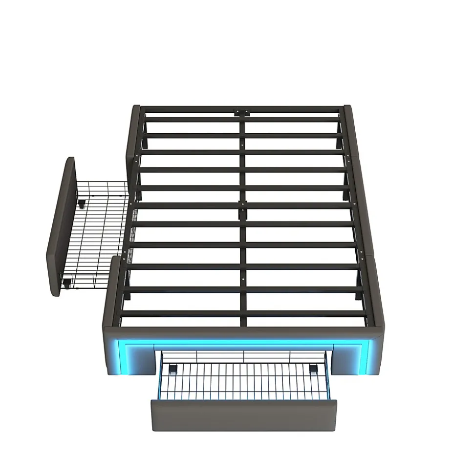 Lit 90×200 cm en simili cuir avec tiroirs et LED – Design sans tête de litCe lit en simili cuir au style épuré est une solution pratique et tendance pour les petites chambres. Grâce à sa base robuste en métal, il supporte jusqu’à 200 kg sans nécessiter de sommier supplémentaire.Doté de plusieurs tiroirs intégrés, il offre un espace de rangement optimal pour vêtements, linge de lit ou accessoires. Une bande LED multicolore au pied du lit, contrôlée à distance, permet de créer une ambiance lumineuse selon vos envies.Caractéristiques :Tiroirs spacieux pour rangement discretBande LED changeante avec télécommande incluseStructure robuste sans tête de lit, personnalisableSimili cuir facile à entretenir et résistantMontage rapide, idéal pour les espaces modernesDétails techniques :Dimensions : 200 x 90 x 32 cmPoids total : 20 kgCapacité de charge : 200 kgMatelas compatible : 90 x 200 cm (épaisseur conseillée : 22-25 cm)Matériaux : Simili cuir + métal + MDFNombre de colis : 1Montage facile, outils inclus