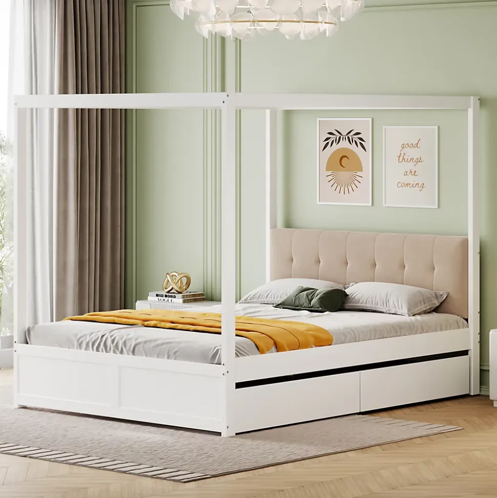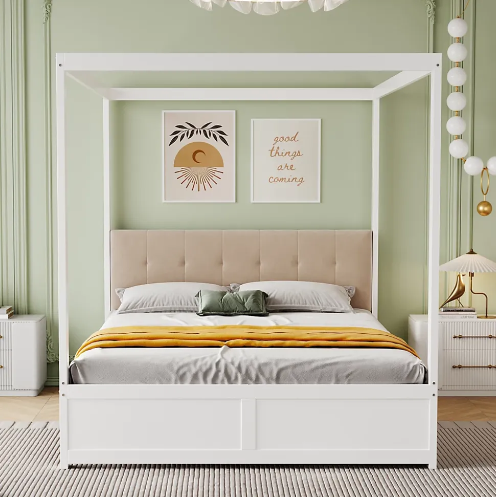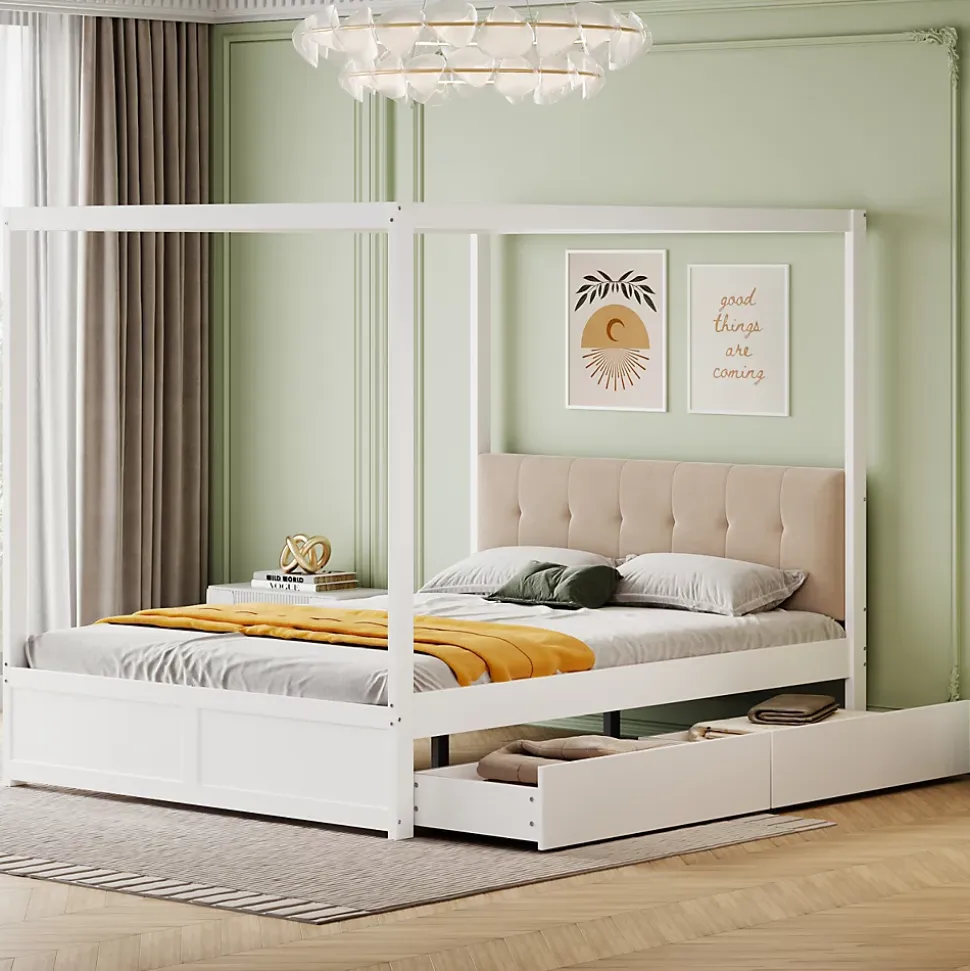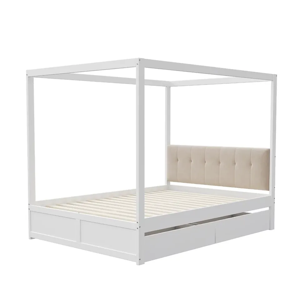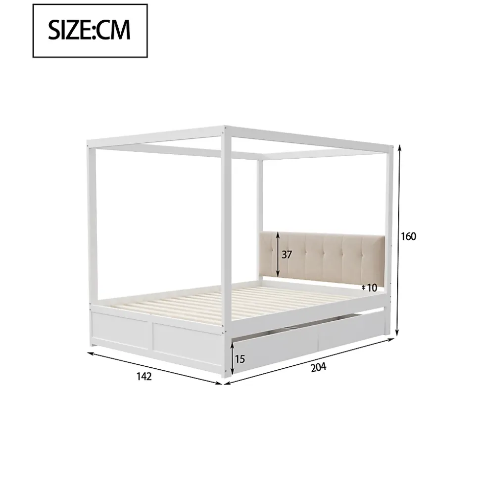 Conception Lit tente 140×200 cm avec rangement et dossier rembourré – BlancApportez confort, praticité et style à la chambre de votre enfant avec ce lit tente élégant et fonctionnel. Sa structure originale en forme de tente peut accueillir une moustiquaire pour protéger des moustiques ou être décorée avec des guirlandes lumineuses, créant un espace ludique et charmant.Caractéristiques principales :Dossier rembourré confortable : Le dossier doux et durable offre un soutien optimal pour lire, jouer ou se détendre.Rangement pratique : Deux tiroirs spacieux sous le lit permettent de ranger jouets, livres, vêtements et linge de lit, aidant à garder la chambre propre et organisée.Design élégant et intemporel : La finition blanche lisse s’intègre parfaitement dans tous les styles de décoration et apporte une touche sophistiquée à la pièce.Structure robuste et durable : Fabriqué en métal, MDF et contreplaqué de haute qualité, ce lit offre un support fiable et une longue durée de vie.Montage facile : Toutes les pièces et outils sont inclus pour un assemblage simple et rapide (environ 1 heure).Poids et dimensions :Dimensions hors tout : 204 x 142 x 160 cmNombre de colis : 2Poids total : 50 kgCapacité de charge : 200 kgÉpaisseur de matelas recommandée : 10-12 cmNombre de lattes : 12Informations complémentaires :Type de produit : Lit modulaireAssemblage complet requisOutils supplémentaires : Inclus (tournevis)Évitez l’utilisation d’outils électriques pour le montage