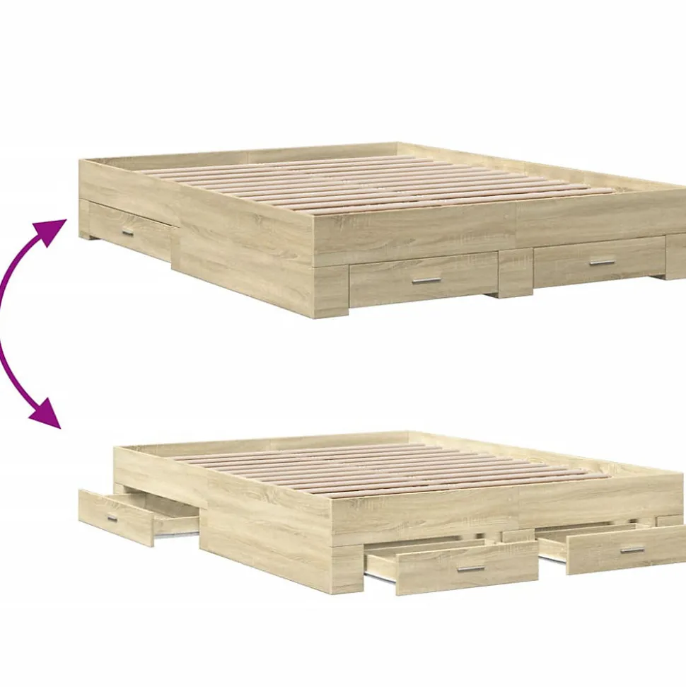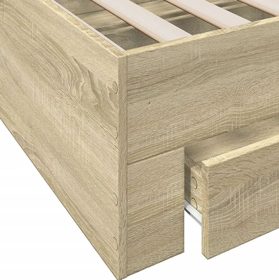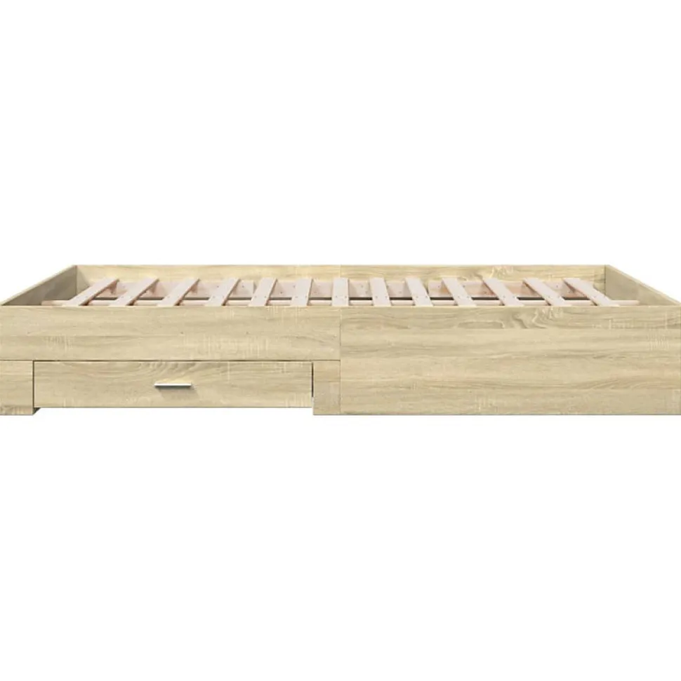 Ajoutez une touche moderne à votre chambre à coucher avec ce cadre de lit avec tiroirs ! Il apportera une touche pratique et décorative à votre espace de vie. Matériau durable : le cadre de lit est fabriquée en bois d’ingénierie. Le bois d’ingénierie est d’une qualité exceptionnelle avec une surface lisse et présente également de la résistance, de la stabilité et de la résistance à l’humidité.Lattes robustes : les lattes de contreplaqué assurent une bonne répartition du poids, garantissant que le matelas reste en place à chaque torsion de votre corps pendant le sommeil.Fonction de rangement : les tiroirs de lit inclus offrent suffisamment d’espace de rangement pour ranger vos articles essentiels, gardant votre pièce propre et bien rangée. Bon à savoir :Un matelas n’est pas inclus avec ce lit. Nous offrons une sélection variée de matelas. Vous pouvez consulter notre boutique pour trouver un matelas assorti. Couleur : chêne sonomaMatériau du cadre de lit : bois d’ingénierieMatériau des lattes : contreplaquéDimensions totales : 203 x 163 x 32 cm (L x l x H)Dimensions du matelas correspondant : 160 x 200 cm (l x L) (matelas non inclus)Dimensions des tiroirs de lit (L) : 81,5 x 31,5 x 13,5 cm (L x l x H)Dimensions des tiroirs de lit (S) : 61,5 x 31,5 x 13,5 cm (L x l x H)Assemblage requis : ouiLa livraison contient :1 x cadre de lit2 x tiroir de lit (L)2 x tiroir de lit (S)Couleur : chêne sonomaMatériau du cadre de lit : bois d’ingénierieMatériau des lattes : contreplaquéDimensions totales : 203 x 163 x 32 cm (L x l x H)Dimensions du matelas correspondant : 160 x 200 cm (l x L) (matelas non inclus)Dimensions des tiroirs de lit (L) : 81,5 x 31,5 x 13,5 cm (L x l x H)Dimensions des tiroirs de lit (S) : 61,5 x 31,5 x 13,5 cm (L x l x H)Assemblage requis : ouiLa livraison contient :1 x cadre de lit2 x tiroir de lit (L)2 x tiroir de lit (S)