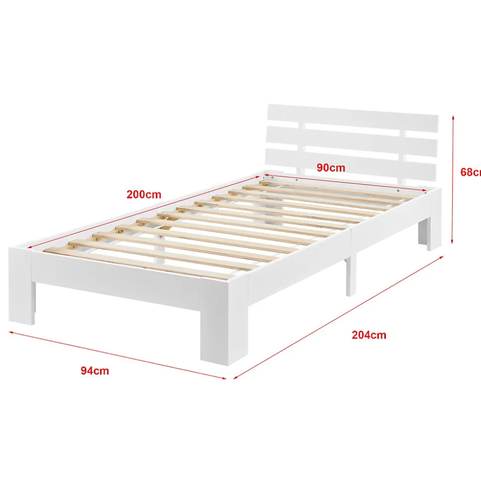- Dimensions : – totales (longueur x largeur x hauteur) : 204 x 94 x 68 cm – surface de couchage (longueur x largeur) : 200 x 90 cm – hauteur de la tête de lit (mesurant du sommier) : 40 cm – distance entre le sol et le dessus du cadre de lit : 30 cm