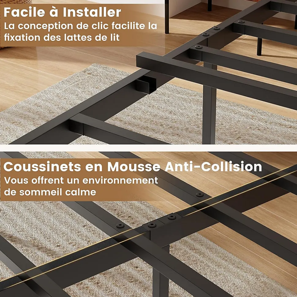 - Support Robuste des Lattes : Profitez de la solidité exceptionnelle de notre cadre de lit à lattes robustes, éliminant le besoin d’un sommier. Ces lattes offrent des performances exceptionnelles à long terme et sont faciles à installer grâce au design encliquetable.