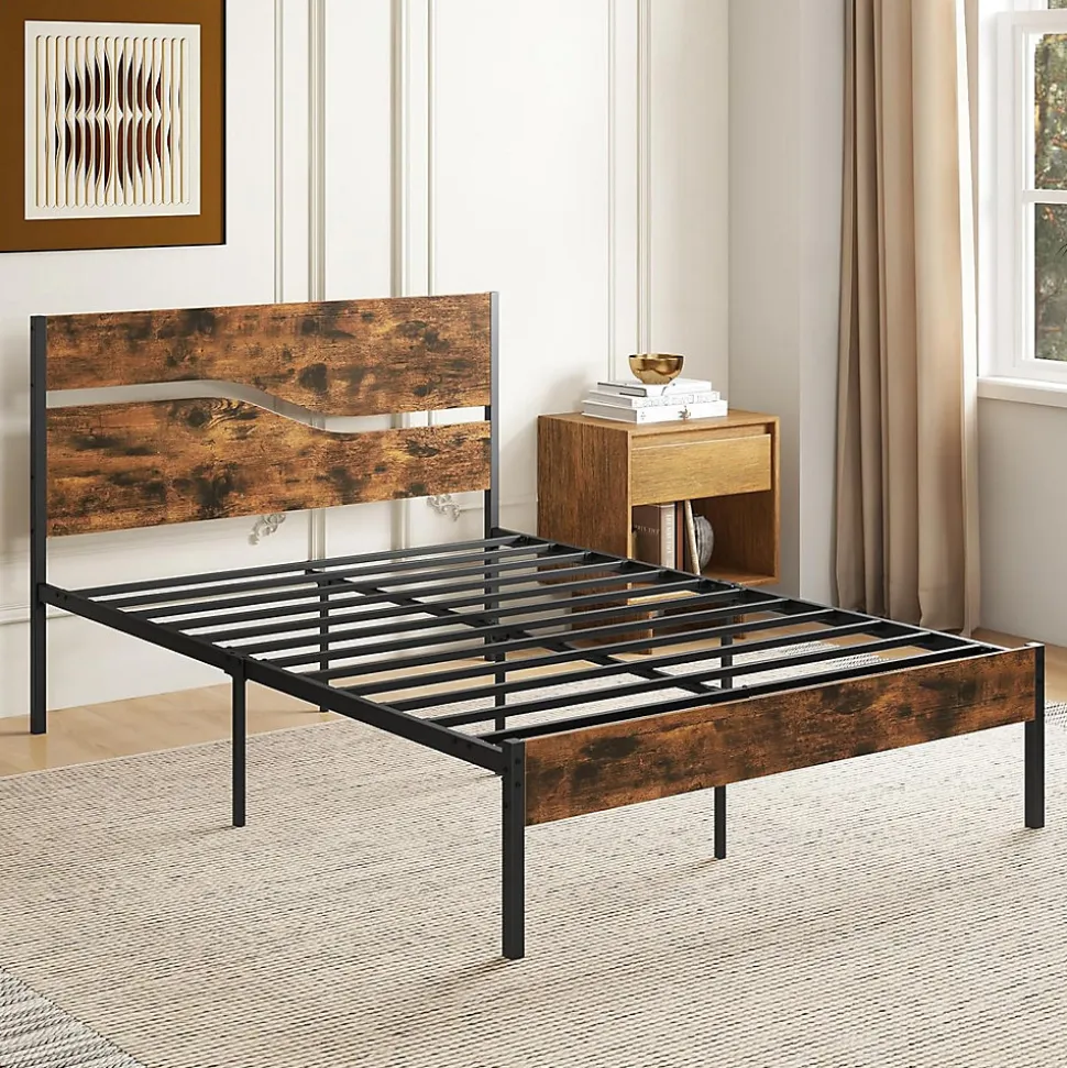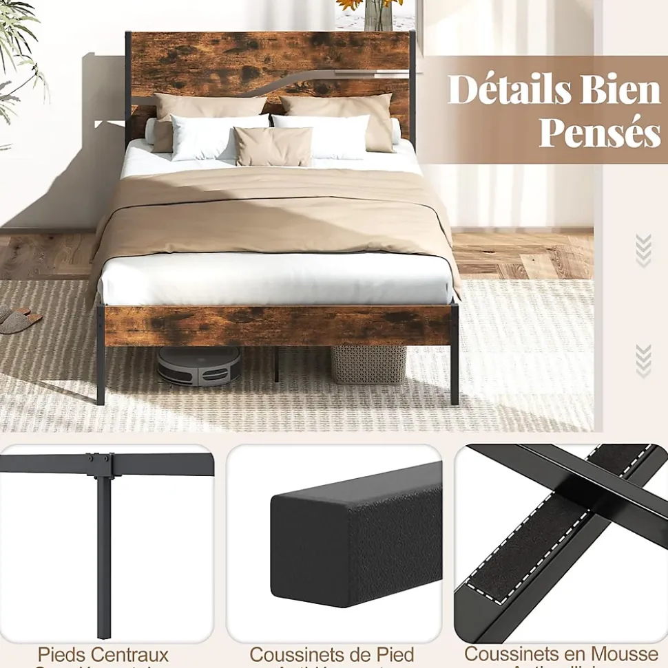 - Tête de Lit Style Industriel Rustique : La tête de lit en bois élégante de ce cadre de lit apporte une ambiance chic à votre chambre. De plus, le cadre en métal sophistiqué et le grain de bois faux ajoutent un charme industriel, en faisant un chef-d’œuvre pour n’importe quelle chambre.