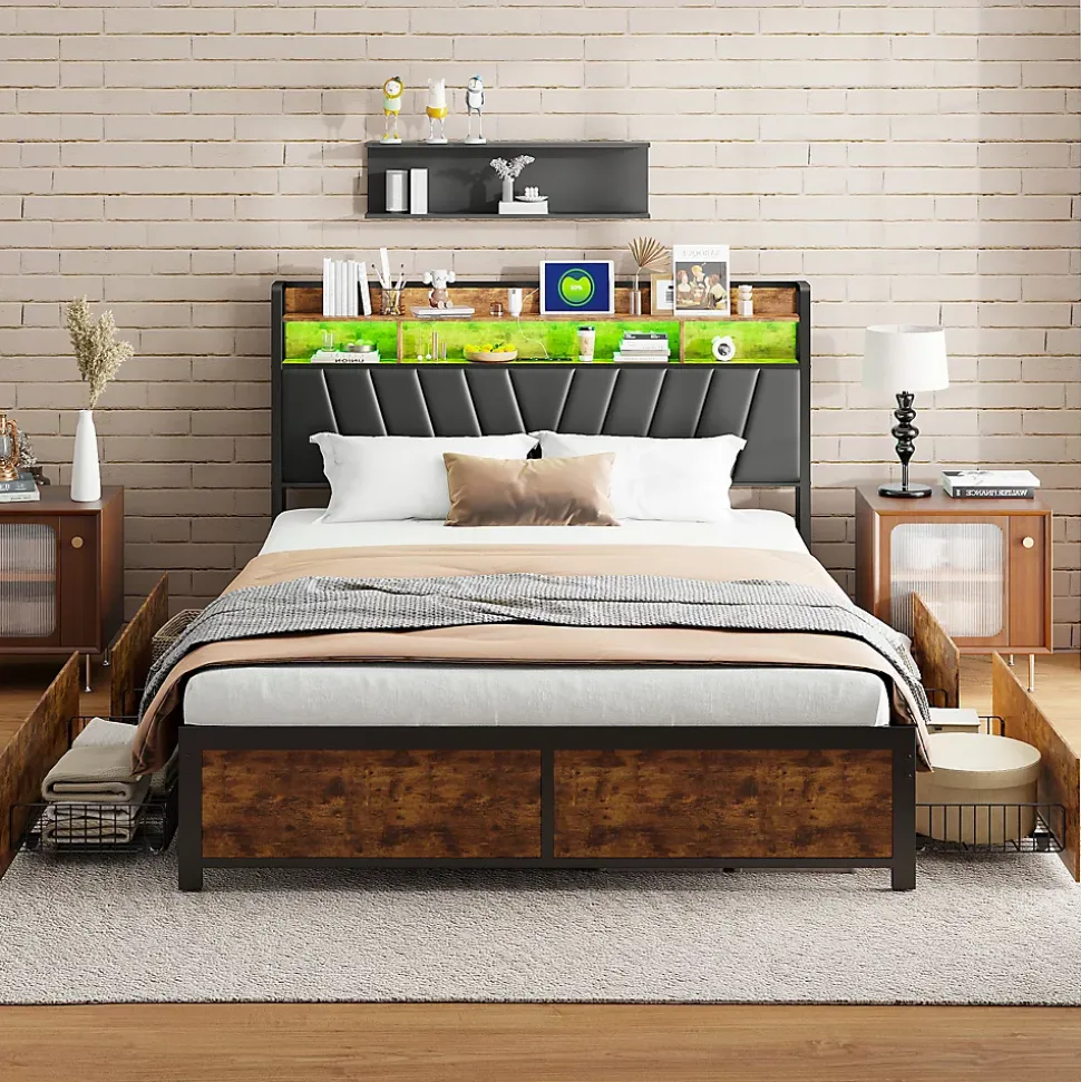 ✦Description du produit1. Éclairage LED intelligent et multicoloreLa bande LED intégrée se contrôle par télécommande ou application, avec plusieurs modes de couleurs. Les fonctions de synchronisation musicale et de minuterie créent une ambiance personnalisée dans la chambre.2. Chargement pratique intégréLa tête de lit dispose de deux ports USB et de deux prises aux normes européennes, idéales pour recharger téléphones, tablettes et petits appareils électroniques.3. Rangement spacieux et fonctionnelQuatre tiroirs de grande capacité, deux de chaque côté du lit, permettent de ranger vêtements, literie et objets du quotidien, optimisant l’espace de la chambre.4. Tête de lit à double compartimentLa conception à double niveau permet de poser livres, réveils ou décorations, alliant esthétique moderne et praticité.5. Structure robuste en acier et boisLe cadre en acier et bois de qualité assure stabilité, durabilité et soutien fiable pour un confort de sommeil optimal.✦Spécifications du produit :- Matériel: bois d’acier + MDF + métal- Dimensions (LxPxH) : 217 x 160 x 112,5 cm- Matelas applicable : 160 x 200 cm- Épaisseur du matelas adaptée : 25 cm – Charge maximale : 300 kg- Couleur : noir, Brown- Distance tête de lit : 25 cm- LED et USB : Oui- Nombre de colis : 2✦ Remarque : ※ Ce produit est livré en 2 colis, qui peuvent arriver séparément. Merci de votre patience.※ Une erreur de mesure de 2 à 3 cm peut survenir en raison des mesures manuelles.※ Des différences de couleur peuvent apparaître en raison de l’éclairage. Veuillez vous référer au produit réellement reçu.※ Si vous avez des questions lors de l’installation, veuillez nous contacter dès que possible.