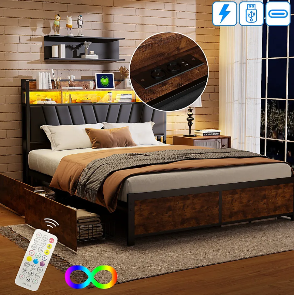 Cadre de Lit Double 160×200 cm avec Tiroirs Coulissants et LED, en Métal Noir et Bois, Parfait pour Chambre d’Adultes, USB, noir