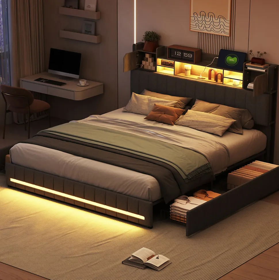 Cadre de lit double spacieux et pratique : ce cadre de lit de 140 x 190 cm est spécialement conçu pour les matelas doubles et offre un confort exceptionnel pour deux personnes. Il dispose d’un sommier à lattes intégré qui garantit un support stable et ferme pour un bon sommeil. Avec ses dimensions généreuses, ce lit est idéal pour la chambre à coucher et apportera une touche moderne à votre intérieur. Lit double rembourré avec espace de rangement intégré. Ce lit double rembourré dispose de quatre tiroirs spacieux qui allient élégance et fonctionnalité. Ces tiroirs offrent une solution de rangement idéale sans affecter votre espace de vie. Que ce soit pour les couvertures, les oreillers ou les vêtements, le lit avec tiroirs offre une solution pratique pour garder votre chambre bien rangée tout en conservant une esthétique raffinée. Tête de lit avec espace de rangement : la tête de lit avec espace de rangement intégré est un ajout précieux à ce lit et peut contenir des livres, des télécommandes ou d’autres petits objets importants. Il met non seulement en valeur l’apparence du lit, mais offre également un espace supplémentaire pour garder votre chambre bien rangée. Ce lit avec tête de lit est idéal pour une organisation efficace et un gain de place. Montage facile : ce lit pour adulte de 140 x 190 cm dispose d’un système de montage simple pour une installation rapide, ce qui le rend parfait pour tous ceux qui ont peu de temps ou pas d’expérience dans le bricolage. Sa finition grise s’adapte à tous les styles de décoration, moderne ou traditionnel, et constitue un meuble moderne, fonctionnel et visuellement attrayant pour votre chambre à coucher. Remarque : Ce lit ne comprend pas de matelas. Matelas adapté : 140 x190 cm. En raison des dimensions plus grandes du cadre de lit double, l’article est expédié dans deux paquets séparés pour assurer une livraison sûre.