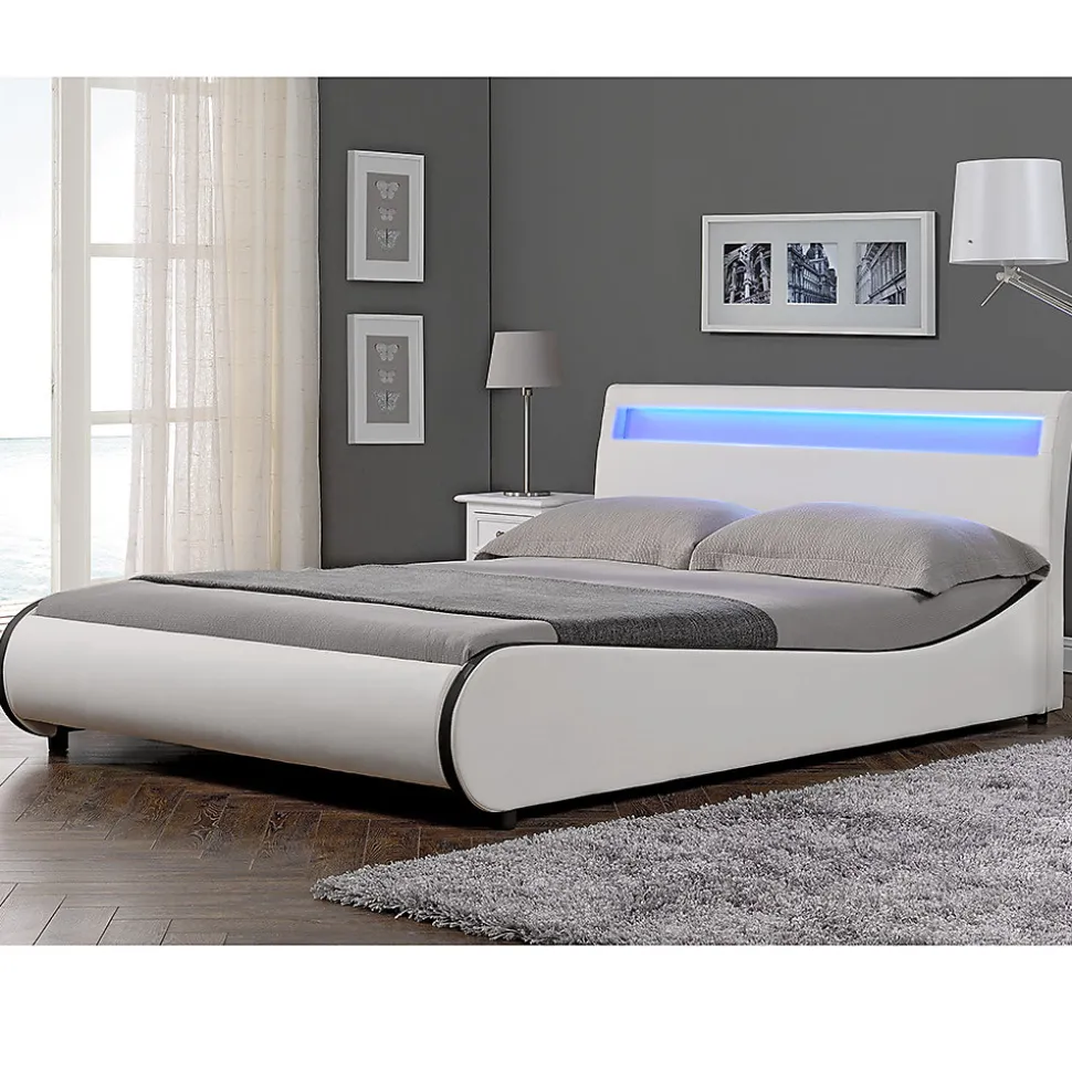 Lit double rembourréCe lit double élégant sera le choix parfait pour votre chambre grâce à son rembourrage en similicuir de qualité et sa forme arrondie. Un éclairage LED est intégré dans la tête de lit qui permet de renforcer l’ambiance de votre maison avec 6 couleurs disponibles. Matière : PU similicuir matCouleur : blanc avec bordure noirDimensons extérieure (lo x la) : ca. 221 x 189 cmSurface de couchage (lo x la) : 200 x 180 cmHauteur de tête de lit : 83 cmContenu de la livraison :1 x lit double1 x sommier à lattes1 x télécommande pour l’éclairage LEDL’oreiller, le matelas, la couverture et les objets déco ne font pas partie de l’offre. Produit de la marque :Corium