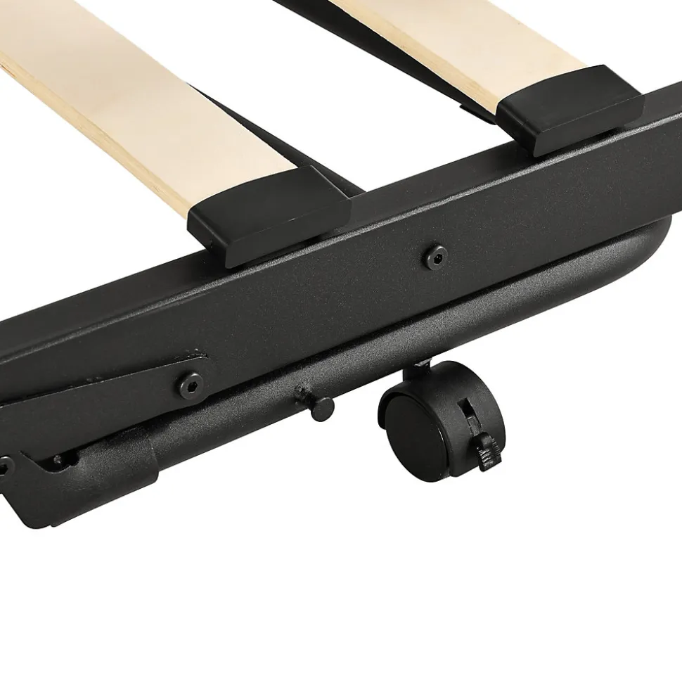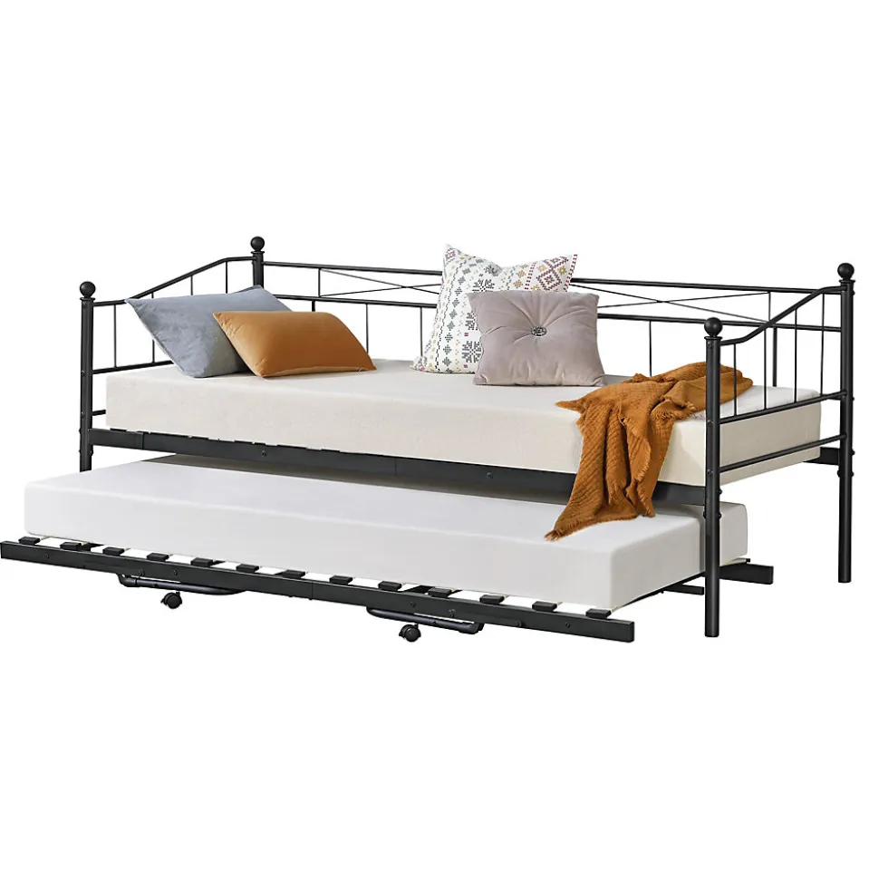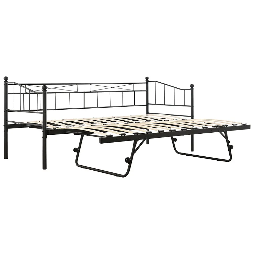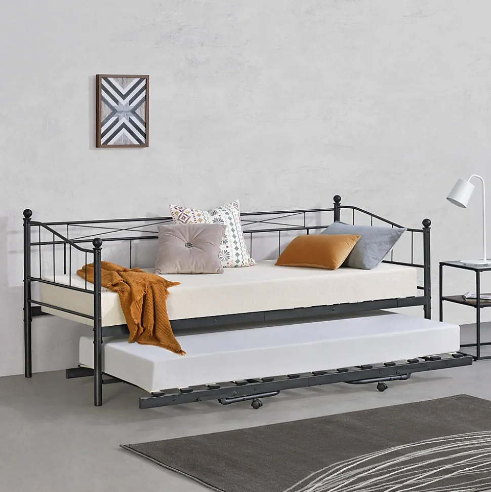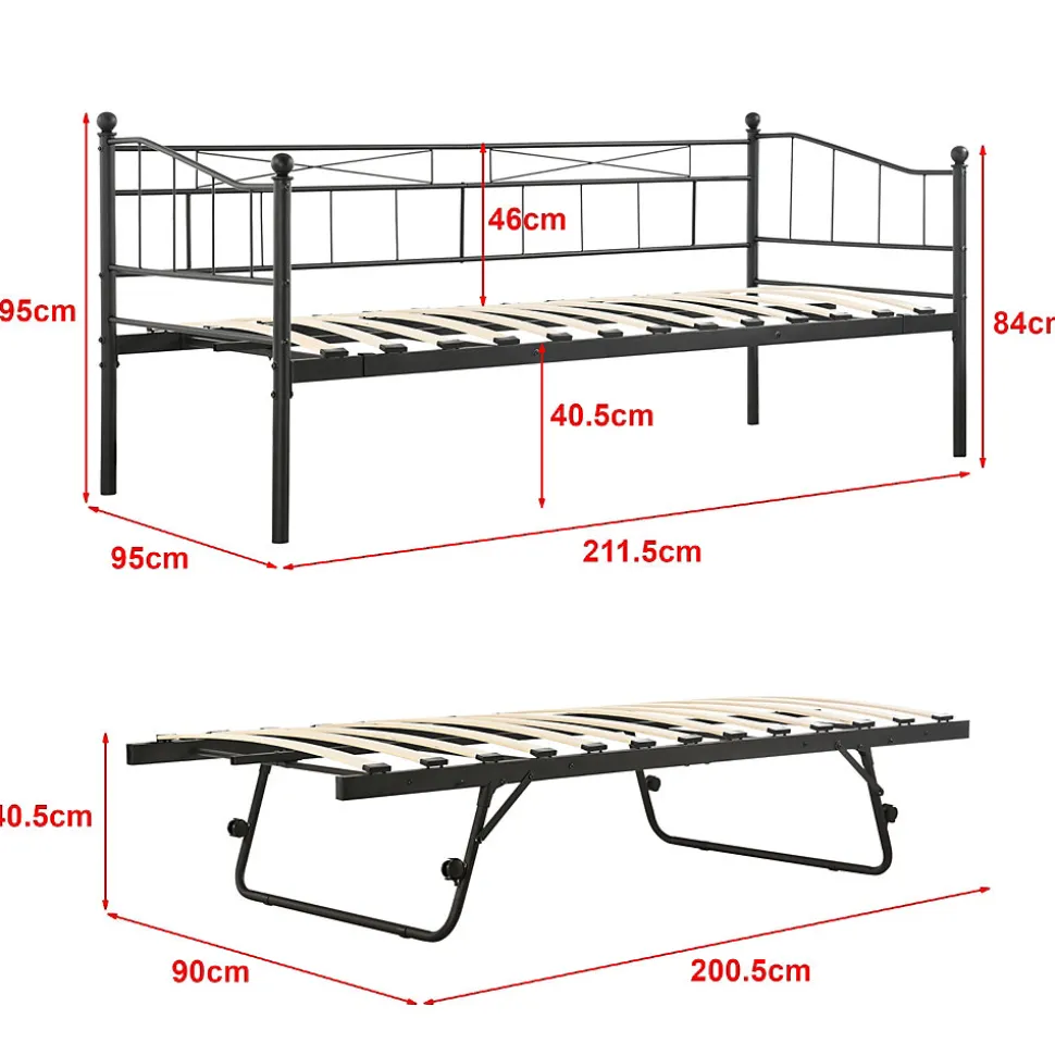 Cadre de lit en métalCe lit gigogne offre un confort optimal pendant le sommeil gâce à sa structure robuste en métal avec des lattes en bois. C’est un lit qui peut vous offrir un second couchage rangeable sous le sommier. 4 roues vous laissent tirer le couchage supplémentaire en cas de besoin sans effort et le cadre déplié permet d’atteindre la hauteur identique que celle du couchage principal.Description :- lit gigogne en métal avec un couchage à 4 roues- second couchage sous le sommier avec cadre dépliable- avec des roulettes verouillables- tête et pieds de lit stylés- construction solide- résistant aux éraillures, aux chocs et à l’usure- assemblage simple et entretien facileCapacité de charge :- lit principal : 150 kg- couchage supplémentaire : 100 kgDimensions :- totales (lo x la x h) : 211,5 x 95 x 95 cm- surface de couchage (lo x la) : 200 x 90 cm- distance entre le sol et le sommier : 40,5 cm- hauteur des poteaux de devant : 84 cm- distance entre le sommier et la barre horizontale du haut du lit : 46 cm- second couchage (lo x la x h) : 200,5 x 90 x 40,5 cm- hauteur du second couchage plié : 14 cmCouleur :noir matMatière :acier laquéContenu de la livraison :- 1 x cadre de lit en métal avec sommier à lattes- 1 x second couchageA noter : le matelas, les oreillers, la couverture et les autres objets décoration ne font pas partie de l’offre.Produit de la marque [en.casa]