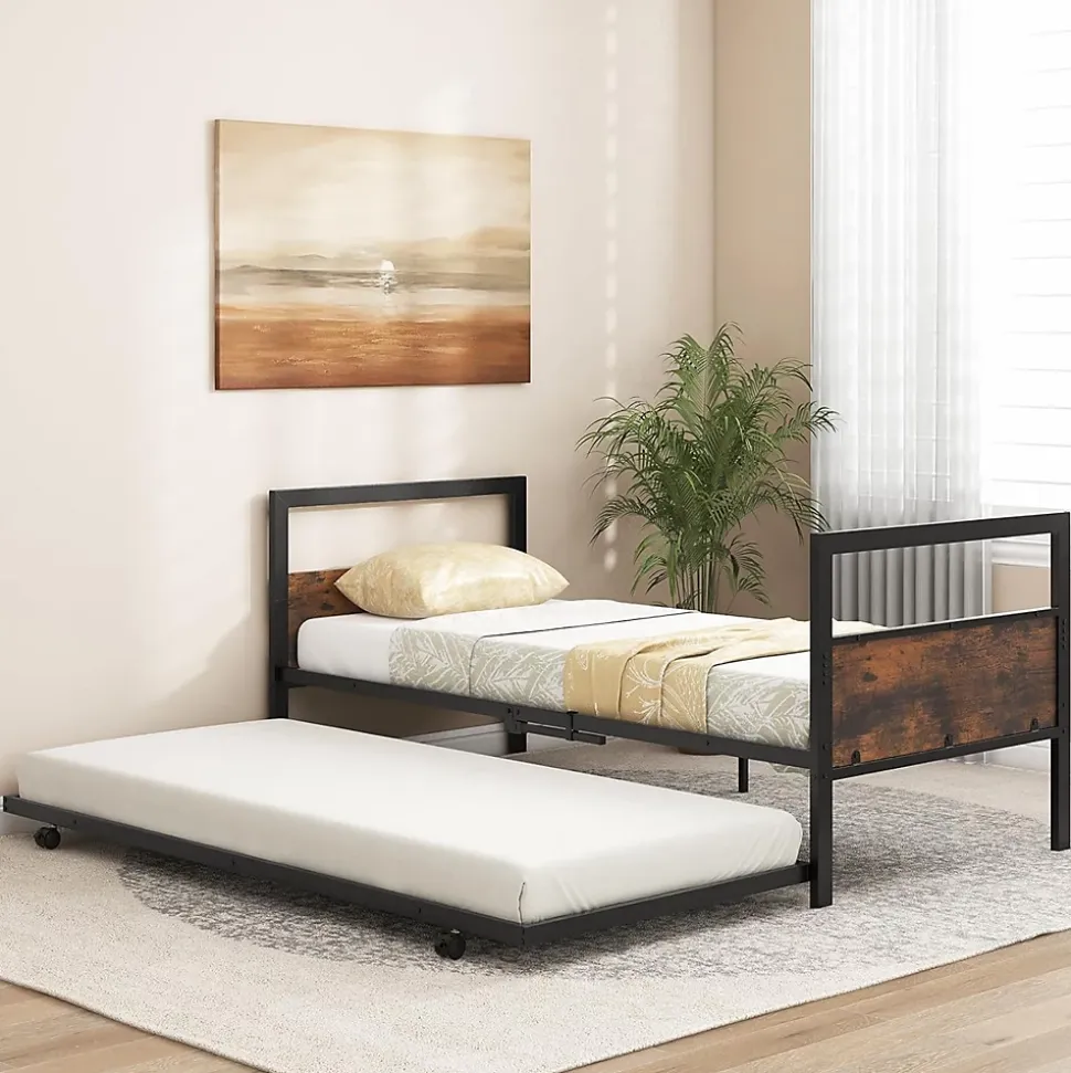 - Style Industriel : Le lit en métal avec lit gigogne présente un design industriel élégant avec une tête de lit et un pied de lit en métal rustique. Ses lignes épurées et épurées complètent parfaitement divers thèmes de décoration, ajoutant de la modernité à votre espace de vie.