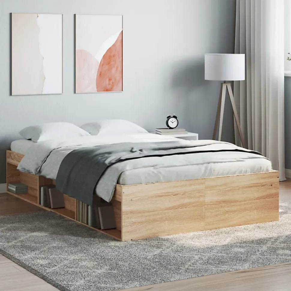 Prenez la voie moderne vers votre chambre à coucher avec ce cadre de lit ! Il sera un supplément pratique et décoratif à votre intérieur. Matériau durable : le bois d’ingénierie est d’une qualité exceptionnelle avec une surface lisse et présente également résistance, stabilité et résistance à l’humidité.Lattes de contreplaqué : les lattes de contreplaqué assurent une bonne répartition du poids, garantissant que le matelas reste en place à chaque torsion de votre corps pendant le sommeil.Espace de rangement supplémentaire : le lit d’appoint dispose d’un total de 6 compartiments sur deux côtés du lit pour ranger des objets comme des livres, des plantes en pot et d’autres décorations. Bon à savoir :Un matelas n’est pas inclus avec ce lit. Nous offrons une sélection variée de matelas. Vous pouvez consulter notre boutique pour trouver un matelas assorti. Couleur : chêne sonomaMatériau du cadre de lit : bois d’ingénierie, bois de pin massifMatériau des lattes : contreplaquéDimensions totales : 193 x 123 x 35 cm (L x l x H)Dimensions du matelas correspondant (matelas non inclus) : 120 x 190 cm (l x L)(petit double)L’assemblage est requisCouleur : chêne sonomaMatériau du cadre de lit : bois d’ingénierie, bois de pin massifMatériau des lattes : contreplaquéDimensions totales : 193 x 123 x 35 cm (L x l x H)Dimensions du matelas correspondant (matelas non inclus) : 120 x 190 cm (l x L)(petit double)L’assemblage est requis