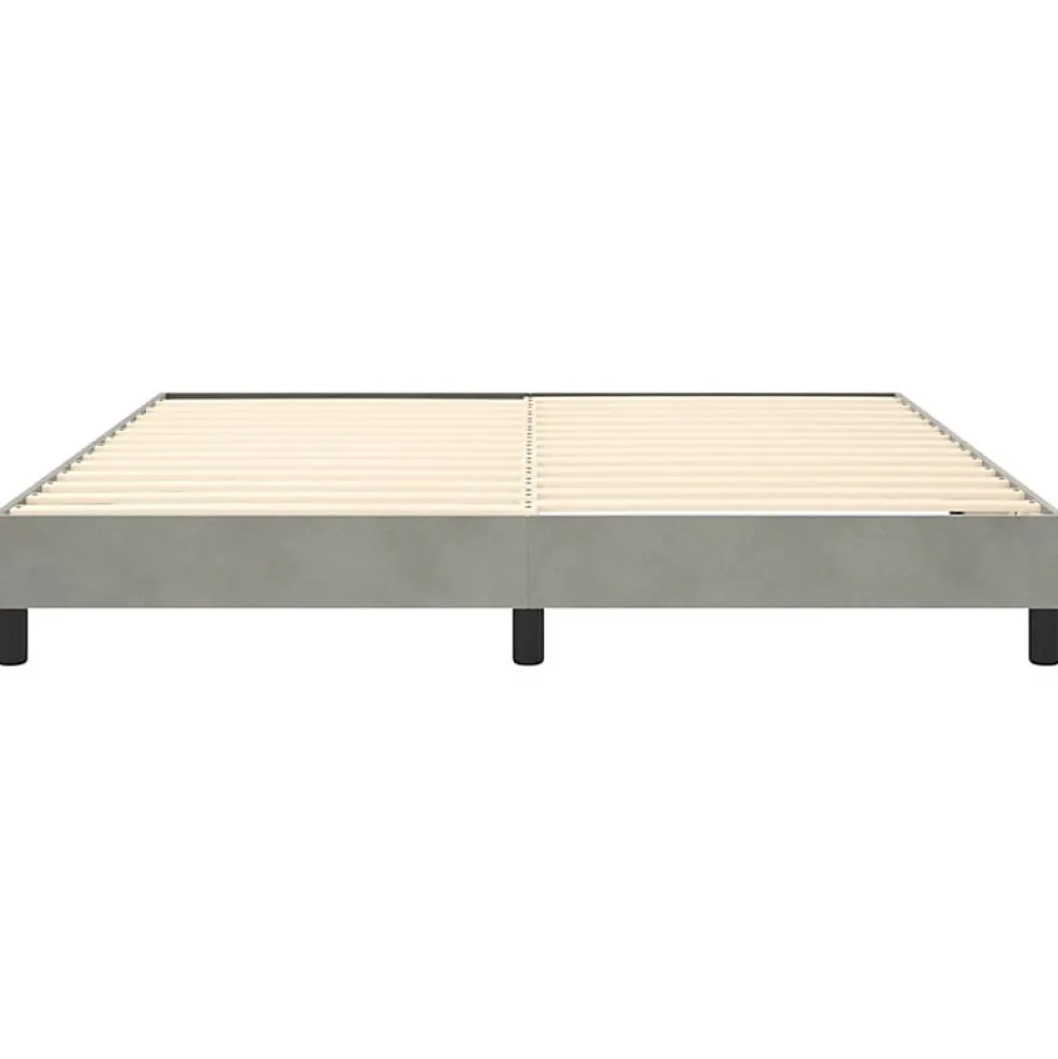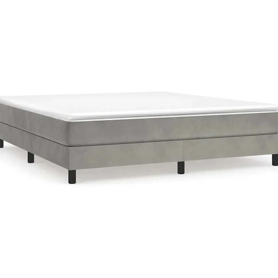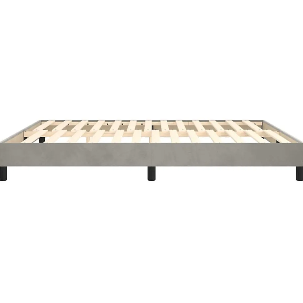 Cadre de lit sans matelas gris clair 180×200 cm en velours, alliant design élégant et robustesse. Structure bois/métal, pieds en acier, lattes en contreplaqué, tissu polyester confortable et résistant. Dimensions totales 203x180x25 cm. Compatible avec matelas 180×200 cm (matelas non inclus).