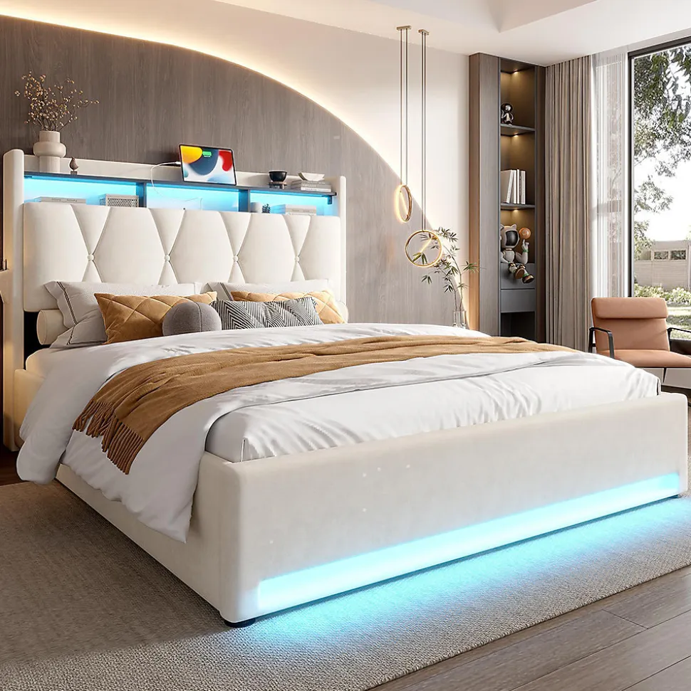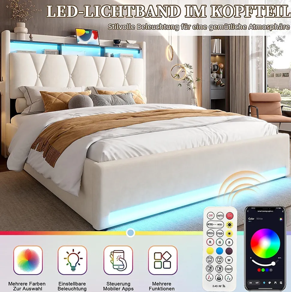- Éclairage LED pour une atmosphère chaleureuse La bande lumineuse LED intégrée à la tête et au pied de lit offre un éclairage indirect agréable. Que ce soit pour lire ou pour créer une ambiance chaleureuse en soirée, l’éclairage crée l’atmosphère parfaite. Moderne, élégant et économe en énergie, il attirera tous les regards dans votre chambre à coucher !