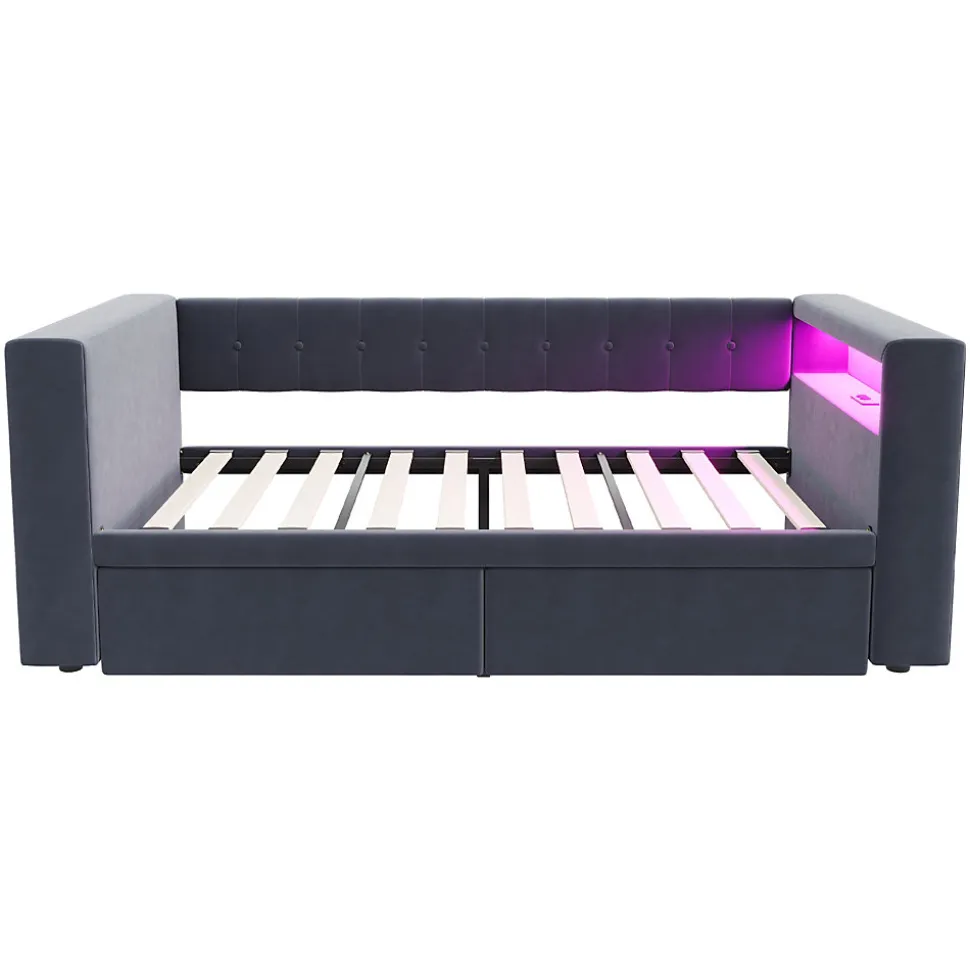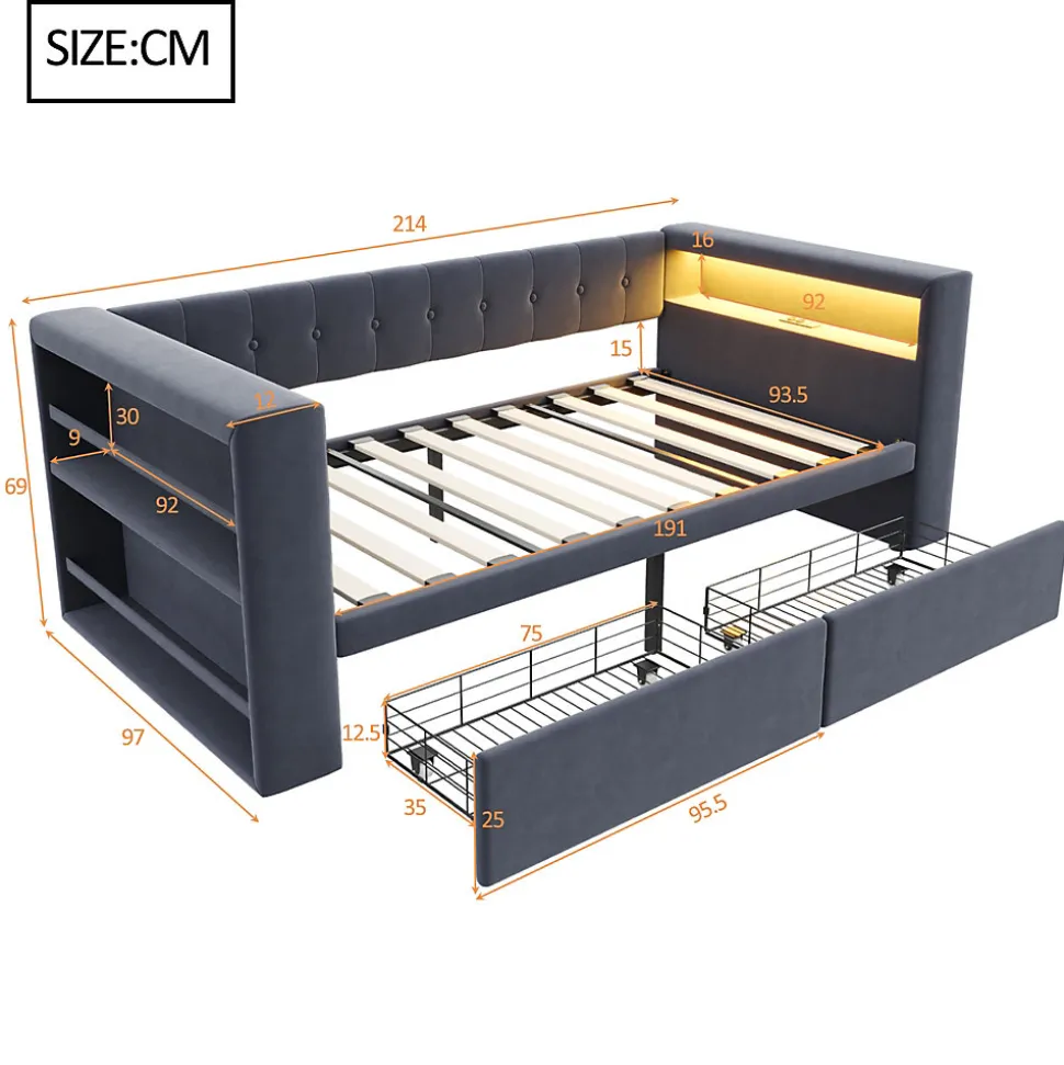 - Design sobre aux lignes équilibrées, revêtement en tissu gris texturé et accoudoirs rembourrés pour un confort visuel et tactile ; dimensions 200x90x85 cm pensées pour s’intégrer dans un salon ou une pièce multifonction.