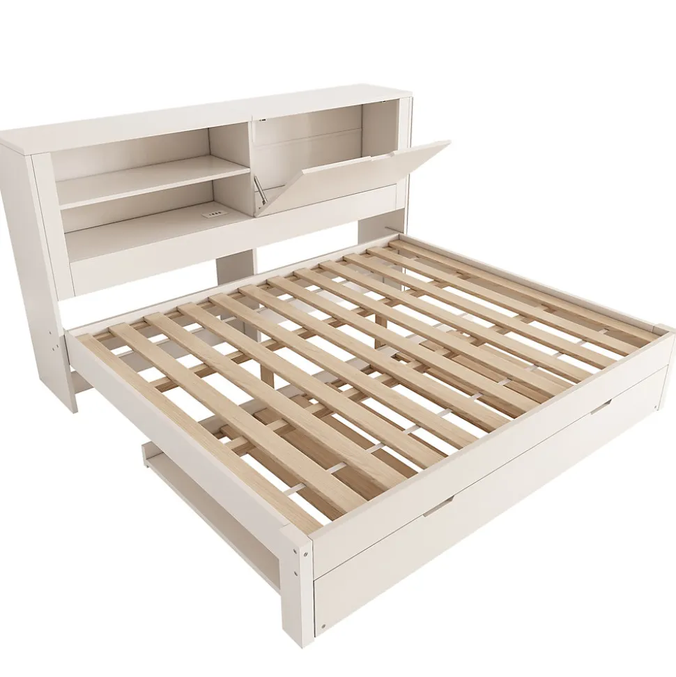 •【Canapé-lit gigogne】Son cadre gigogne est doté de poignées incurvées et de quatre roulettes pour un dépliage facile. Lorsqu’il n’est pas utilisé, il se glisse sous le lit pour un gain de place optimal. Deux des roulettes sont équipées de freins pour une stabilité accrue.•【Rangement dans le dossier】Le compartiment de rangement de droite est muni d’un couvercle à charnière, offrant un espace de rangement astucieusement dissimulé. Des charnières, des vérins à gaz et une fermeture magnétique de haute qualité garantissent une fermeture fluide, silencieuse et élégante.•【Station de charge pratique】L’étagère du dossier intègre une station de charge avec trois ports USB (dont un compatible avec la charge rapide) et un port USB-C, vous permettant de recharger simultanément votre téléphone et autres appareils électroniques avant de vous coucher.•【Détails du produit】Ce produit est fabriqué en bois de haute qualité pour une structure robuste. Le sommier à lattes encastrées empêche le matelas de glisser. L’autocollant rond blanc fourni masque parfaitement les trous de fixation. Remarque : les lits gigognes mesurent 90 x 190 cm. Il est recommandé d’utiliser un matelas de ces dimensions et d’une épaisseur maximale de 13 cm.•【Facile à assembler】Des instructions détaillées et des pièces complètes sont disponibles pour vous aider à réaliser l’assemblage rapidement.