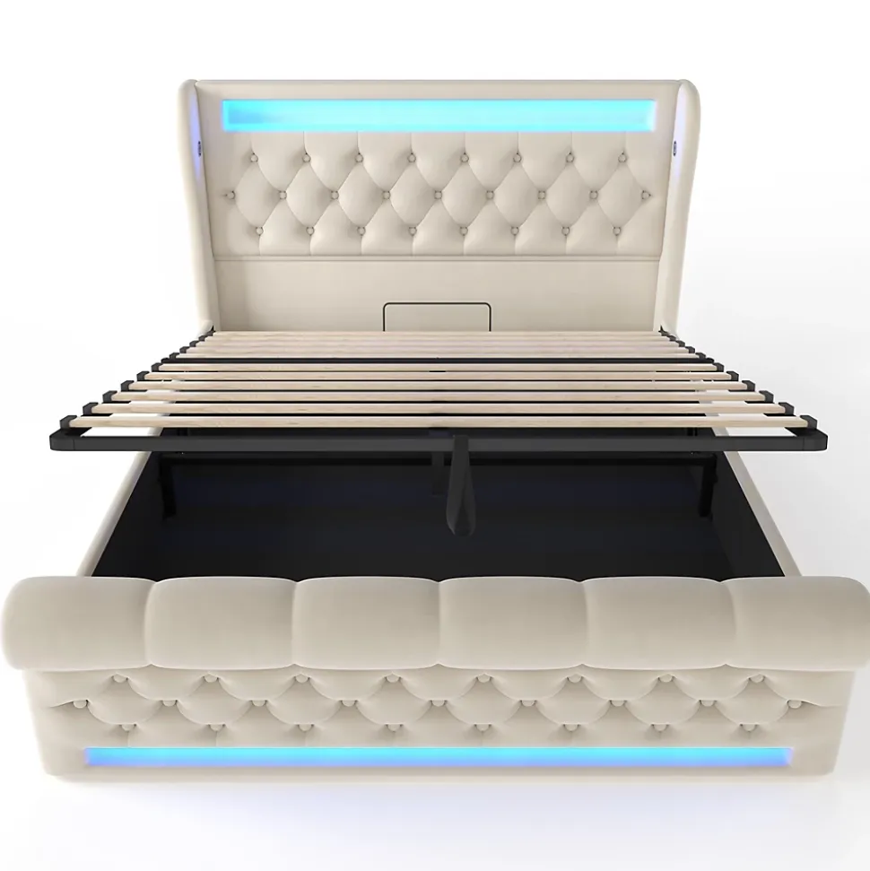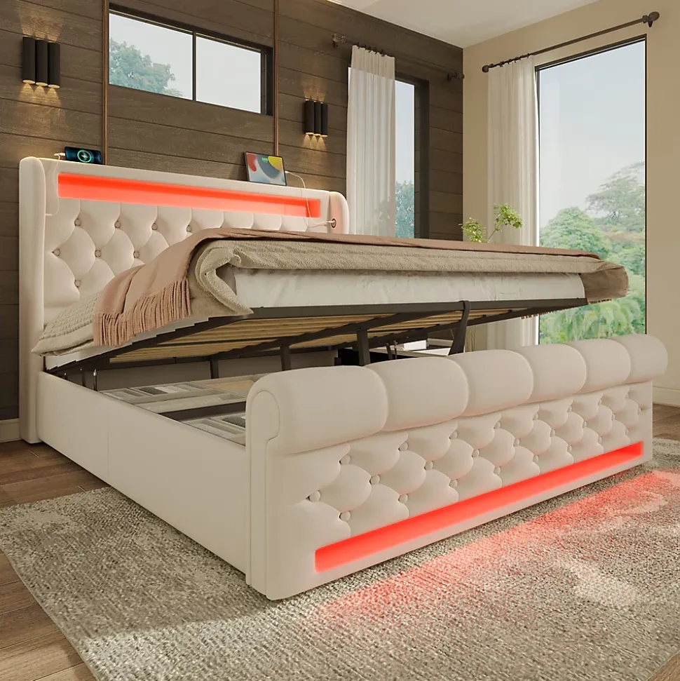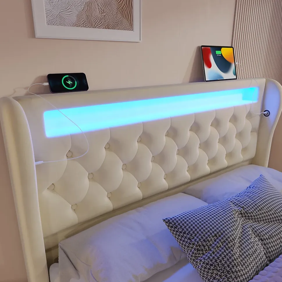 Design & styleCe canapé-lit présente un design classique et élégant : tête et pied capitonnés à motifs losange, côtés profilés et pied cylindrique pour une allure raffinée. Le revêtement en velours beige apporte une touche chaleureuse et une finition douce au toucher.Éclairage & connectivité Bandes LED encastrées à la tête et au pied avec modes dynamiques, minuterie et synchronisation musicale. Contrôle via application mobile ou télécommande, choix parmi plus de 60 000 couleurs pour une ambiance personnalisée. Stations de charge intégrées (USB + Type-C) de chaque côté pour recharger vos appareils sans quitter le lit.Rangement & structureSommier à ouverture hydraulique offrant un coffre ample et un accès facilité par cordon au pied; plancher protégé par une toile anti-poussière. Barres métalliques et rainures latérales assurent la stabilité du matelas. Matelas non fourni (compatible 160×200 cm, épaisseur recommandée 20-25 cm).Matériaux & entretienStructure robuste, revêtement en velours facile d’entretien avec un chiffon doux. Housse amovible sous la tête pour éviter le glissement des coussins et faciliter le nettoyage. Capacité utilisateur maximale indiquée : 300 kg.Installation & livraisonMontage requis, deux personnes recommandées. Produit livré en 2 colis avec notice et outillage simple; les colis peuvent arriver séparément. Poids brut/ net total : 58,9 kg / 52,7 kg. Cadre de lit livré sans matelas.
