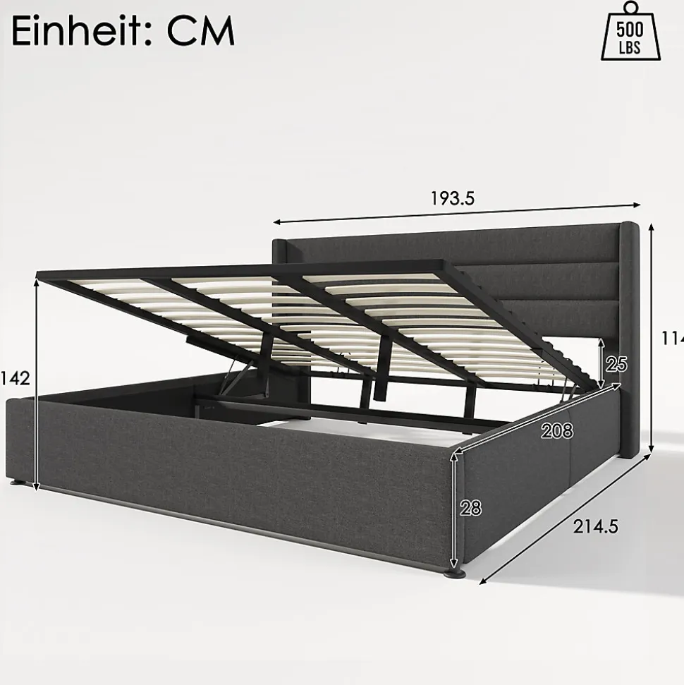 - Coffre de grande capacité sous le sommier à lattes, mécanisme hydraulique avec sangle pour lever facilement le cadre et accéder au rangement; matelas compatible 180×200 cm (matelas non inclus).