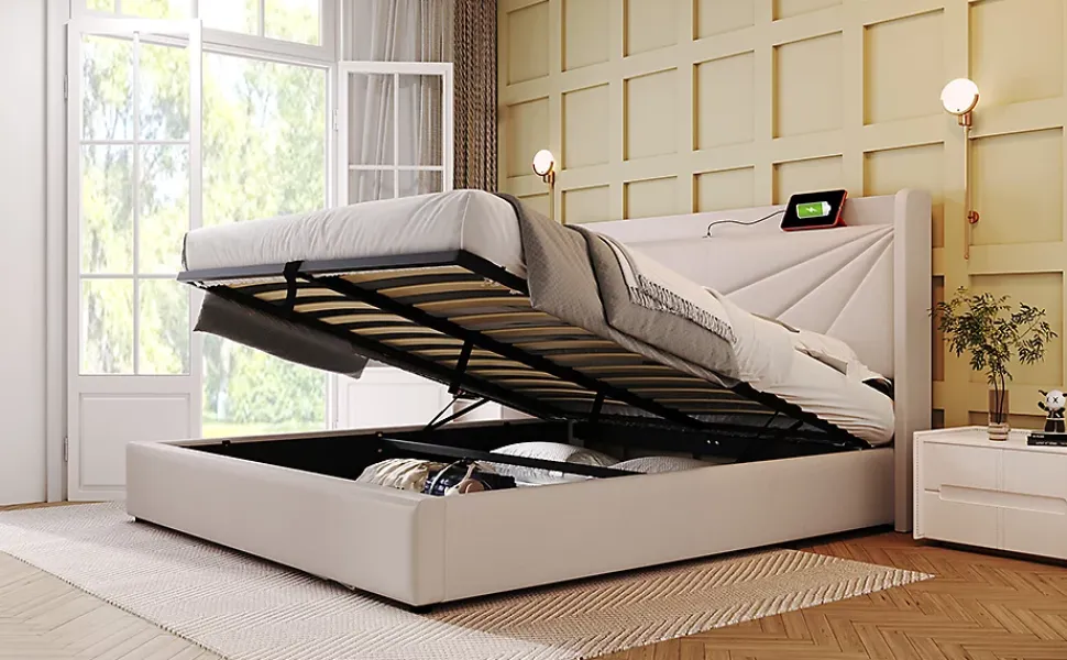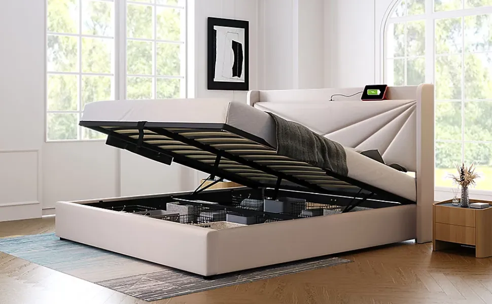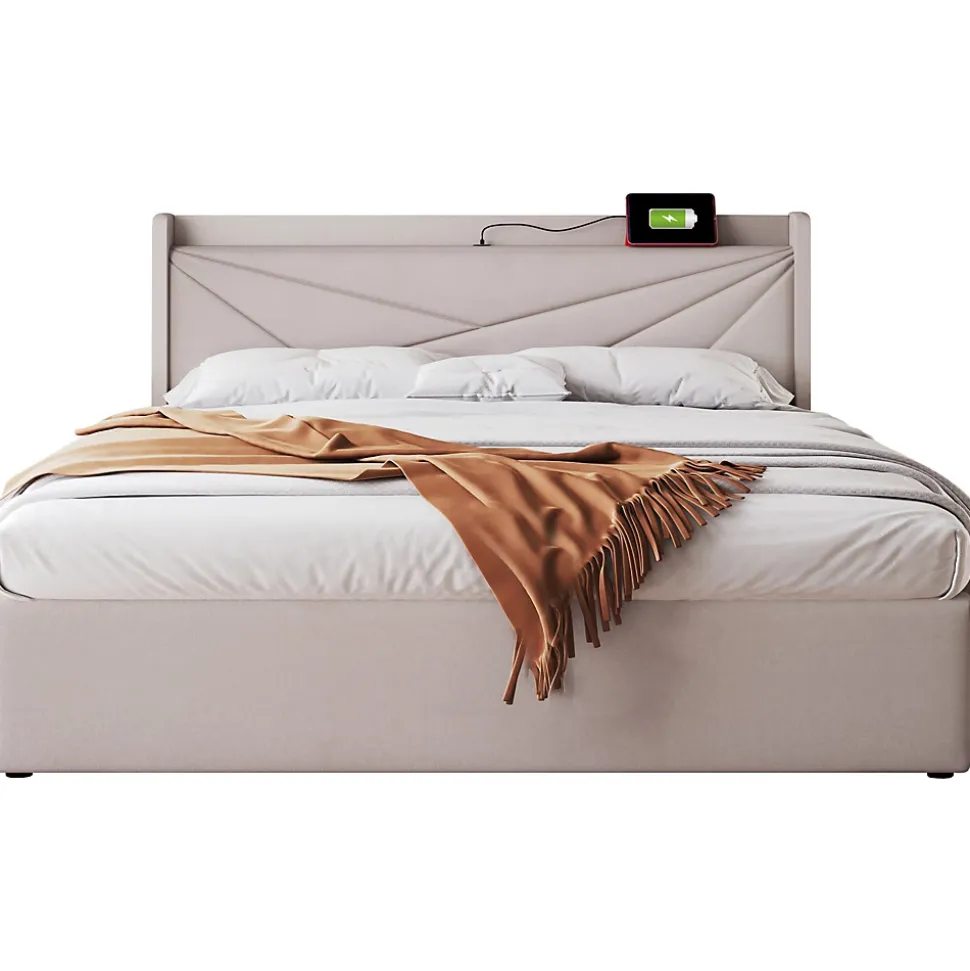 Design & styleCe canapé‑lit présente une tête de lit géométrique en maille twill et un revêtement lin‑coton beige, rembourrée de mousse pour un confort visuel et un accueil doux. Ses lignes sobres s’adaptent aux décors contemporains et minimalistes.Fonction & couchage Compatible avec une matelas 180×200 cm (matelas non fourni). Structure métallique associée à un sommier à lattes en bois massif offrant une assise stable et une capacité d’utilisation jusqu’à 300 kg (environ 660 lbs). Barres de maintien pour matelas afin de limiter les glissements.Matériaux & entretienCadre en métal, tête de lit rembourrée en mousse et revêtement en tissu lin‑coton pour un toucher naturel. Les lattes sont en bois élastique pour un soutien ergonomique. Entretien simple avec un chiffon doux et nettoyage ponctuel adapté au tissu.Rangement & ergonomieGrand coffre de rangement sous le sommier, doublé d’un non‑tissé noir pour limiter la poussière et protéger le contenu. La tête de lit intègre des ports USB et Type‑C pour recharger facilement vos appareils depuis le lit.Installation & emballageMontage requis, deux personnes recommandées. Produit livré en 2 colis (dimensions totales 186x208x107 cm) pouvant arriver séparément. Si des pièces manquent après réception des deux colis, merci de contacter le service client pour assistance.