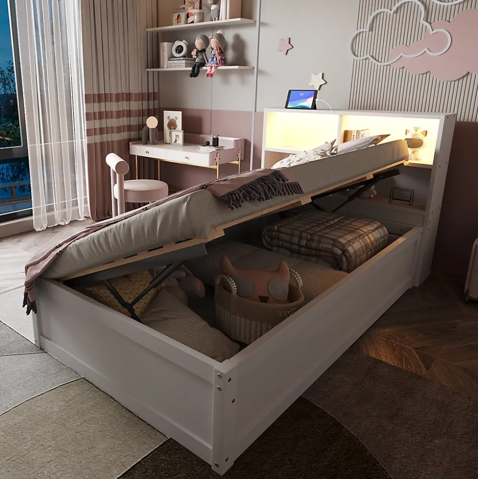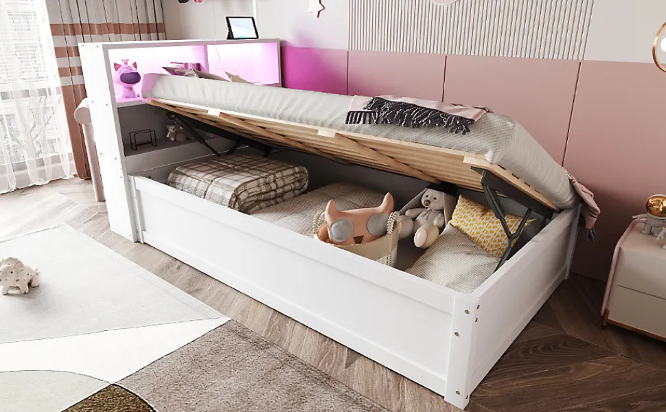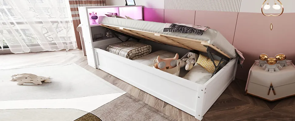 Prise multifonction intégréeCe lit simple en bois massif dispose d’une prise multifonction intégrée compatible avec différents types d’appareils, vous permettant de les recharger à tout moment tout en vous reposant ou en travaillant.Grand espace de rangementCe lit en bois massif possède 4 grands compartiments de rangement pour vos effets personnels.Bande LED contrôlableLa tête de lit est équipée d’une bande LED pouvant être contrôlée via votre smartphone ou une télécommande. Lorsqu’elle est commandée par smartphone, la lumière clignote au rythme de la musique, créant une ambiance agréable.Cadre en bois massifLe canapé-lit est fabriqué en bois massif de haute qualité, garantissant une longue durée de vie. La couleur blanche s’adapte à tous les styles de décoration. La combinaison d’une fonctionnalité moderne et d’un design élégant le rend compatible avec tous les intérieurs.Design gain de placeCe canapé-lit multifonction optimise l’espace limité et est idéal pour accueillir des invités.