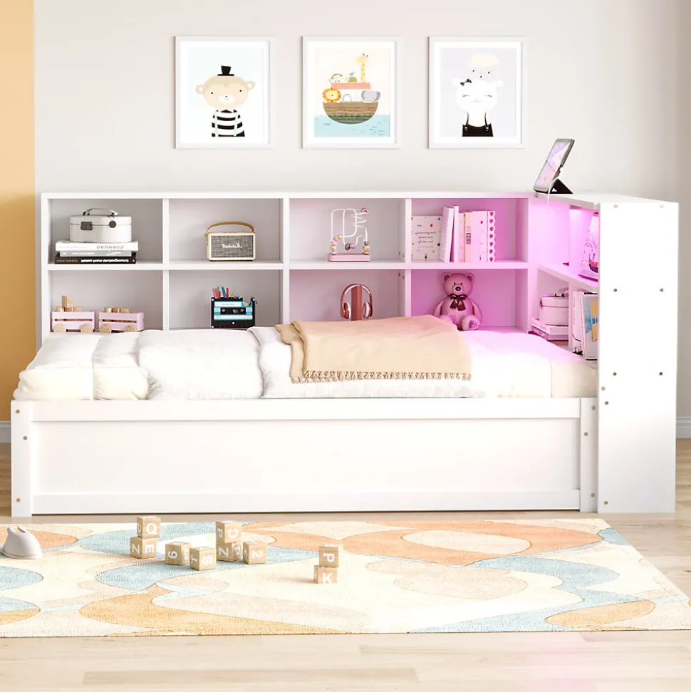 Prise multifonction intégréeCe lit simple en bois massif dispose d’une prise multifonction intégrée compatible avec différents types d’appareils, vous permettant de les recharger à tout moment tout en vous reposant ou en travaillant.Rangements suffisantsCe canapé en bois massif possède plusieurs compartiments de rangement intégrés, offrant un espace suffisant pour vos affaires.Bande LED contrôlableLa tête de lit est équipée d’une bande LED pouvant être contrôlée via votre smartphone ou une télécommande. Lorsqu’elle est contrôlée par smartphone, la lumière clignote au rythme de la musique, créant une ambiance agréable.Cadre en bois massifLe canapé-lit est fabriqué en bois massif de haute qualité, garantissant une longue durée de vie. La couleur blanche s’adapte à tous les styles de décoration. La combinaison d’une fonctionnalité moderne et d’un design élégant le rend compatible avec tous les intérieurs.Design gain de placeCe canapé-lit multifonction optimise l’espace limité et est idéal pour accueillir des invités.