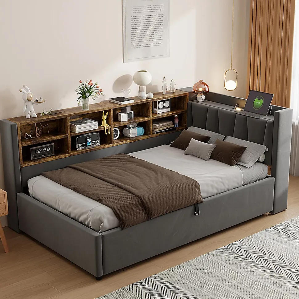 SpécificationsCouleur principale : GrisMatériau principal : VeloursDimensions du lit : 90 cm × 200 cmMatériau de rembourrage : VeloursDimensions du produitLongueur assemblé (cm) : 214,50Largeur assemblé (cm) : 100,50Hauteur assemblé (cm) : 81,00Poids du produit (kg) : 49,00Dimensions de l’emballageSous-article 1 : 197,79 × 34,98 × 11 cm 25,9 kgSous-article 2 : 96,8 × 37,39 × 23,98 cm 26,8 kgCaractéristiques du produitTête de lit rembourrée multifonctionnelle – La tête de lit rembourrée de ce canapé-lit intègre une veilleuse, des ports de recharge USB et Type-C, ainsi qu’un espace de rangement, offrant un éclairage pratique tout en vous permettant de ranger et de recharger vos appareils à tout moment. La tête de lit rembourrée à rayures classiques offre un confort optimal et confère au lit un aspect élégant et intemporel.Système de rangement hydraulique dissimulé — Ce lit rembourré avec mécanisme de rangement hydraulique offre un vaste espace de rangement dissimulé pour les livres, les jouets, les vêtements et bien plus encore.Tissu velours doux et agréable au toucher — Fabriqué à partir d’un tissu velours de haute qualité, le lit rembourré offre un toucher doux, pour une expérience luxueuse et confortable, que ce soit en position assise ou allongée.Espace de rangement généreux – Plusieurs compartiments de rangement sur les côtés du lit offrent une grande capacité de rangement, permettant de garder une chambre à coucher bien rangée et organisée. La finition bois des compartiments s’harmonise avec le tissu d’ameublement, créant une solution de rangement pratique et élégante.Robuste et durable – Ce lit rembourré multifonctionnel est doté d’un sommier à lattes robuste qui soutient le matelas et garantit un confort durable. Il peut supporter un poids maximal de 150 kg.