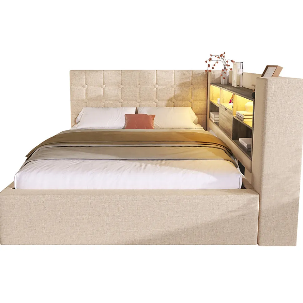 •【Éclairage LED et ports de chargement】Les compartiments de rangement sont équipés de bandes LED intégrées, contrôlables via une application ou une télécommande, avec plus de 60 000 couleurs, minuterie et modes dynamiques. Trois ports USB-A (dont un rapide) et un port USB-C facilitent le chargement des appareils.•【Design flexible en forme de L】La tête de lit offre deux options d’installation, adaptée à différentes configurations de chambre. Fabriquée en lin et panneaux bois couleur noyer, offrant un dossier confortable et moelleux.•【Grand espace de rangement】Compartiments ouverts à double niveau pour livres ou cadres photo, avec couvercle à charnière. L’espace sous le lit s’ouvre facilement grâce à un système hydraulique et des sangles de traction.•【Robuste et stable】Cadre en fer forgé avec barres de soutien en U pour empêcher le matelas de glisser, garantissant un sommeil confortable.•【Facile à assembler】Des instructions détaillées et toutes les pièces nécessaires permettent un assemblage rapide et simple.