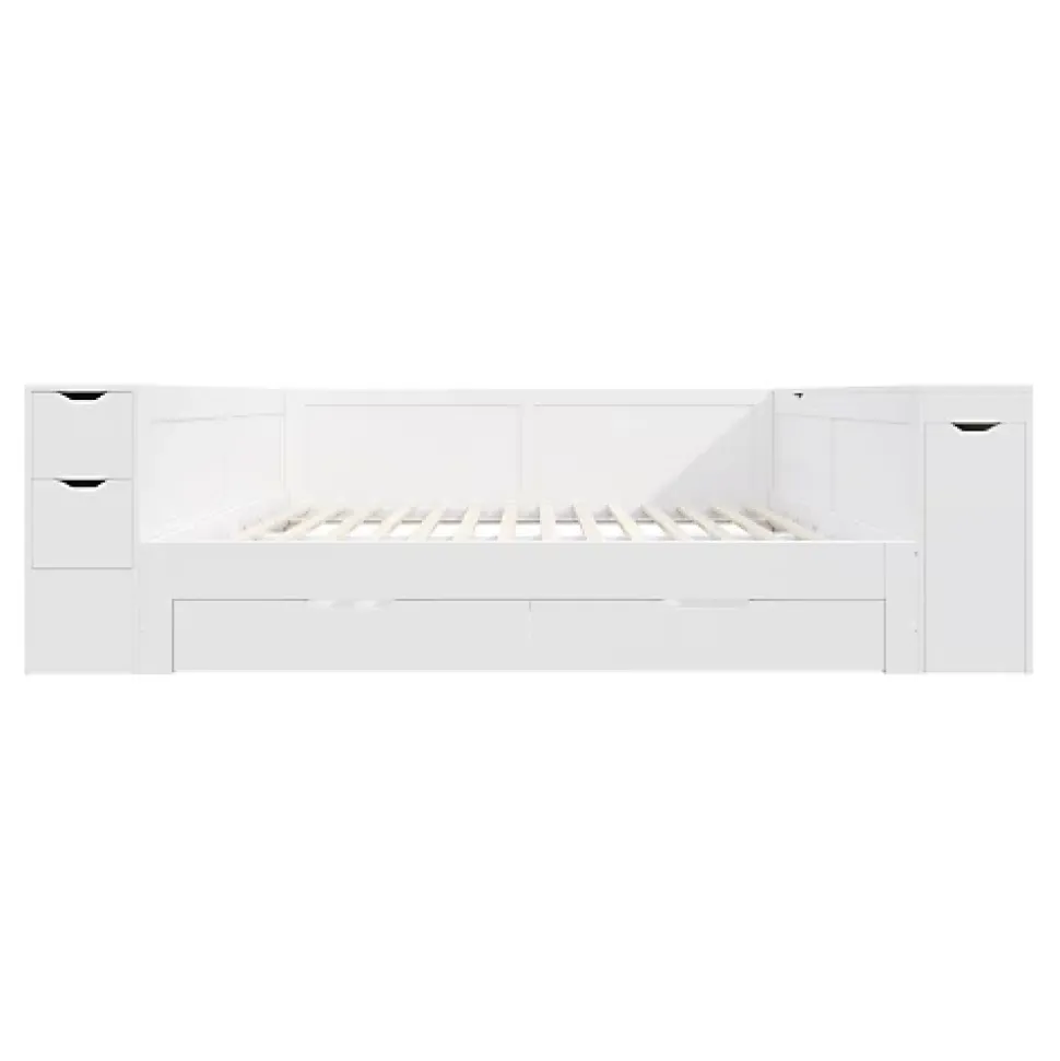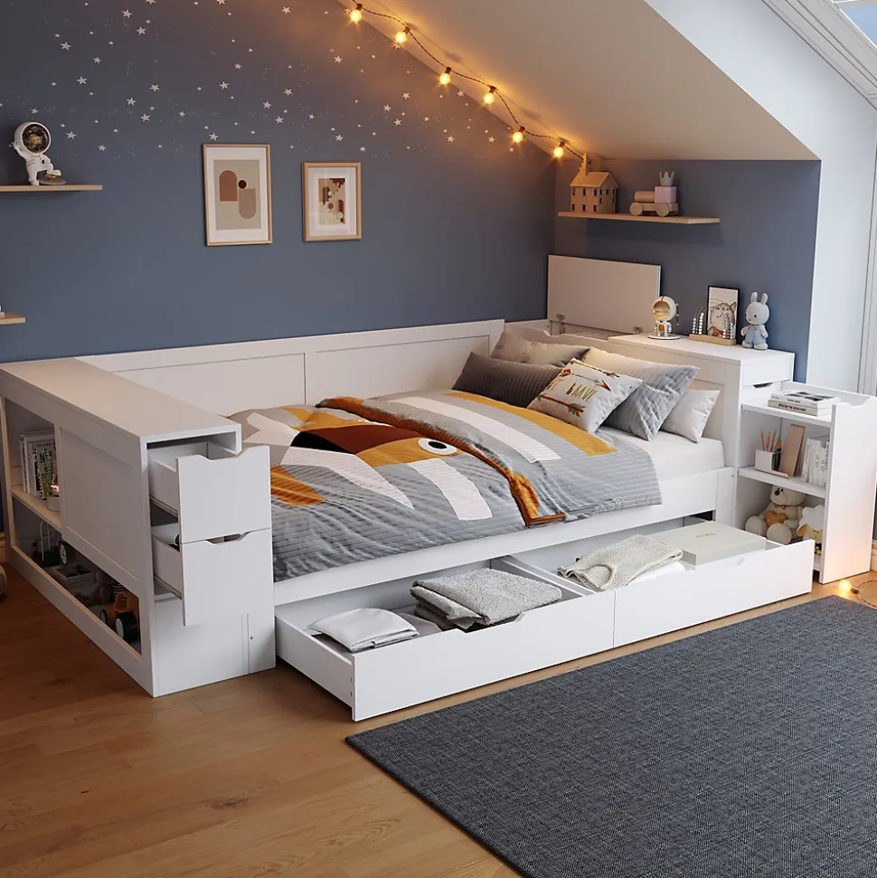 •【Disponible en plusieurs tailles】Deux tailles, 90x200cm et 140 x 200 cm, sont disponibles pour répondre aux besoins variés des chambres d’enfants, des petits appartements ou des pièces multifonctionnelles, et créer facilement un espace de couchage confortable.•【Lit multifonction】Combinant les fonctions d’un canapé-lit et d’un lit bébé, il peut servir de canapé confortable ou de coin lecture le jour et de lit confortable la nuit. Lit multifonction, compact et pratique.•【Espace de rangement spacieuxÉquipé d’un tiroir extra-large de 58 cm de profondeur, d’un coffre de rangement pratique et d’une table de chevet à tirette, il offre de nombreuses possibilités de rangement pour les jouets, les livres, le linge de lit et autres objets.•【Simple et polyvalent】Sa couleur blanche fraîche apporte une sensation de simplicité et d’espace, et s’intègre facilement dans un style moderne, nordique ou une chambre d’enfant pour créer une atmosphère lumineuse et ordonnée.•【Conception sûre】Fabriquée en bois sélectionné de haute qualité, la structure est robuste et durable, et les coins arrondis sont plus sûrs pour protéger les enfants à chaque instant de l’utilisation quotidienne.•【Facile à assembler】Des instructions détaillées et des pièces complètes sont disponibles pour vous aider à réaliser l’assemblage rapidement.