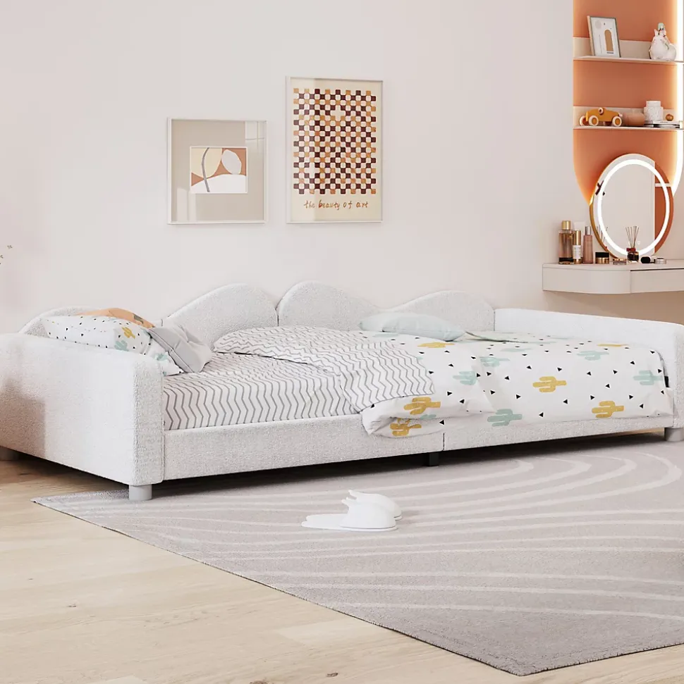 Cadre de lit multifonctionnel – Ce lit rembourré au design unique peut également servir de canapé-lit. Idéal pour le salon ou la chambre, il peut aussi être utilisé comme lit modulable pour adultes et invités.Tissu Teddy doux – Revêtement en tissu Teddy doux et confortable, résistant à l’usure et qui ne peluche pas, apportant chaleur et confort à votre espace.Confort et adaptabilité – Équipé d’un dossier, d’une tête et d’un pied de lit, il peut être placé librement à gauche ou à droite dans n’importe quelle pièce. Hauteur modérée pour un confort optimal.Support par lattes solides – Structure à 12 lattes en bois offrant un soutien robuste et durable. Capacité maximale : 120 kg. Les lattes assurent également une meilleure ventilation pour un sommeil agréable.Montage facile – Dimensions totales : 214,5 x 95 x 42 cm. Livré en colis avec tous les outils et instructions nécessaires. Installation rapide par deux personnes en environ 30 minutes.