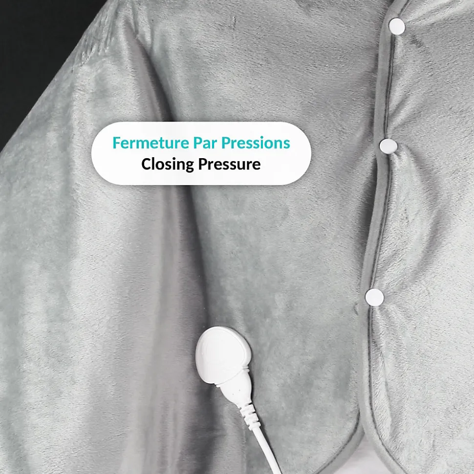 CONFORT – Les pressions ajustables de notre cape vous permettent de créer des manches et de l’ajuster selon votre préférence, tandis qu’elle reste toujours en place, quelle que soit votre position. Sa taille XXL s’adapte à toutes les morphologies, vous enveloppant entièrement pour une sensation de confort optimal. La très grande zone de chauffe garantit une répartition uniforme de la chaleur sur l’ensemble de votre corps.ÉCONOMIES – Diminuez la température de votre salon d’un ou deux degrés et bénéficiez d’une économie d’énergie allant de 7% à 20%, ce qui se traduit par des économies considérables. Notre cape chauffante est conçue pour être moins gourmande en électricité, vous permettant ainsi de rester au chaud tout en réalisant des économies.PERSONNALISÉ – Profitez de la commodité de notre télécommande qui vous permet de choisir facilement parmi 3 niveaux de chauffe (35°, 40°, 45°). Une LED clairement visible indique le niveau sélectionné pour un contrôle précis de la chaleur. Pour votre sécurité, notre cape est équipée d’une protection antisurchauffe et d’un arrêt automatique après 3 heures d’utilisation, vous offrant une tranquillité d’esprit totale.PRATIQUE – Notre cape est lavable à la main grâce à son câble d’alimentation détachable, ce qui la rend pratique à nettoyer et à entretenir. Sa matière 100% velours polyester au toucher peau de pêche est non seulement douce mais aussi durable. Avec un poids de 1,4 kg et des dimensions de hauteur de dos de 90 cm et largeur totale de 150 cm (dépliée), 130 cm (fermée), elle offre une couverture généreuse.CARACTÉRISTIQUES – Matière : 100% velours polyester au toucher peau de pêche – Poids : 1,4 kg – Dimensions : Hauteur de dos 90 cm ; Largeur totale 150 cm (dépliée), 130 cm (fermée) – Alimentation : Secteur 230 V / 50 Hz | 220-240V | 120W câble 160 cm – Certifications : CE, RoHS et AZO, garantissant une utilisation en toute sécurité.