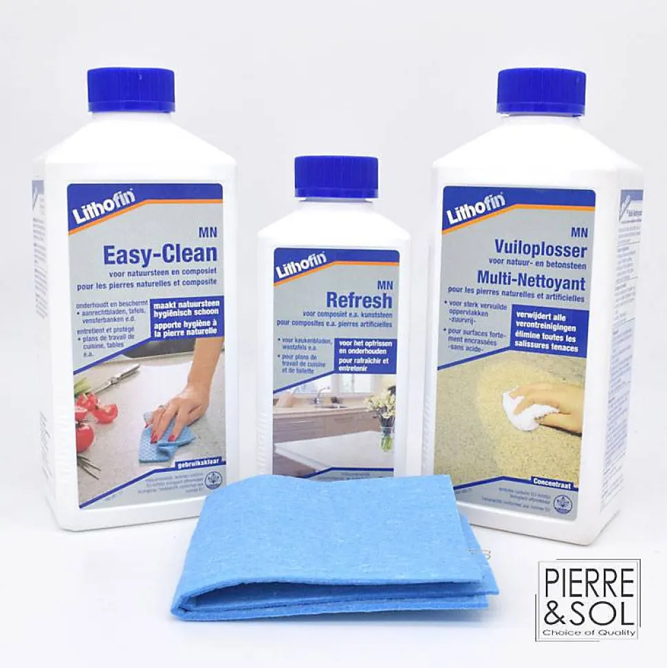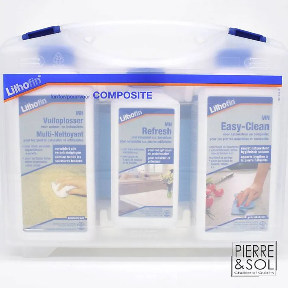 Care Kit Composite – LithofinKit d’entretien spécial pierre composite.Contient :MN Multi-Nettoyant 500 mlMN Refresh 250 mlMN Easy-Clean spray 500 ml