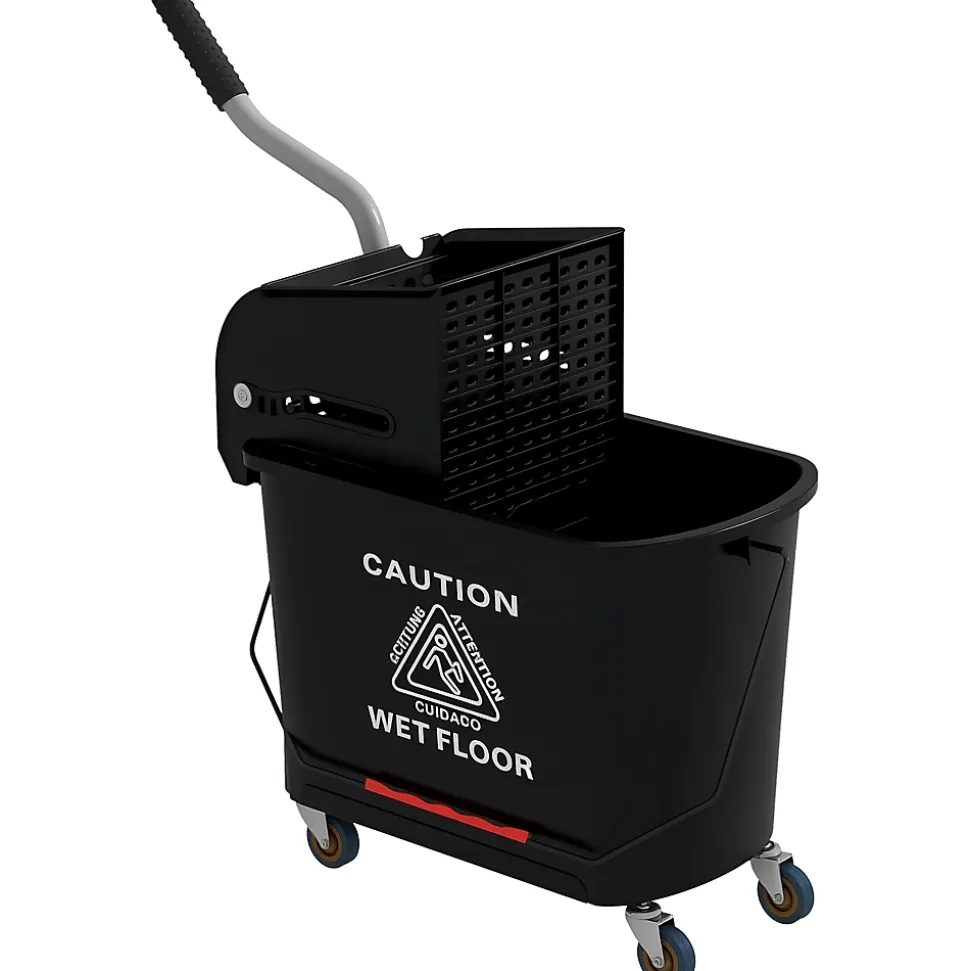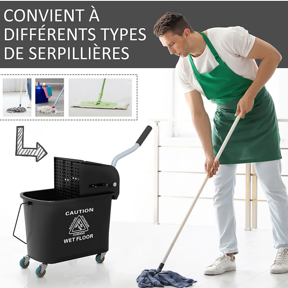 Ce chariot de nettoyage lavage sur roulettes vous facilitera grandement vos ménages ! Equipé d’un essoreur et d’un séparateur eau propre et sale, vous pourrez nettoyer vos sols avec une grande rapidité et efficacité.Caractéristiques :- Chariot de nettoyage lavage avec essoreur et séparateur d’eau- Grande capacité de contenance de 20 L- Facile à déplacer grâce à ses 4 roulettes et à sa poignée- Muni d’un manche pour le transporter facilement- Poignée robuste en acier inoxydable- Essoreur et séparateur d’eau amovibles pour un entretien facile- Montage et utilisation très facileSpécifications :- 4 coloris au choix : jaune, bleu, rouge, noir-Matériaux principaux : plastique PP et métal-Dimensions totales : 60L x 27l x 71H cm- Capacité de contenance max. : 20 L- Diamètre roulettes : 5 cm- Longueur manche poignée : 32 cm- Réf. : 720-002/002V00BU/002V00RD/002V00BK