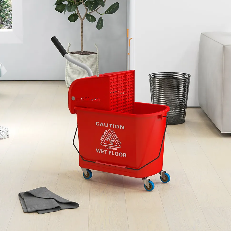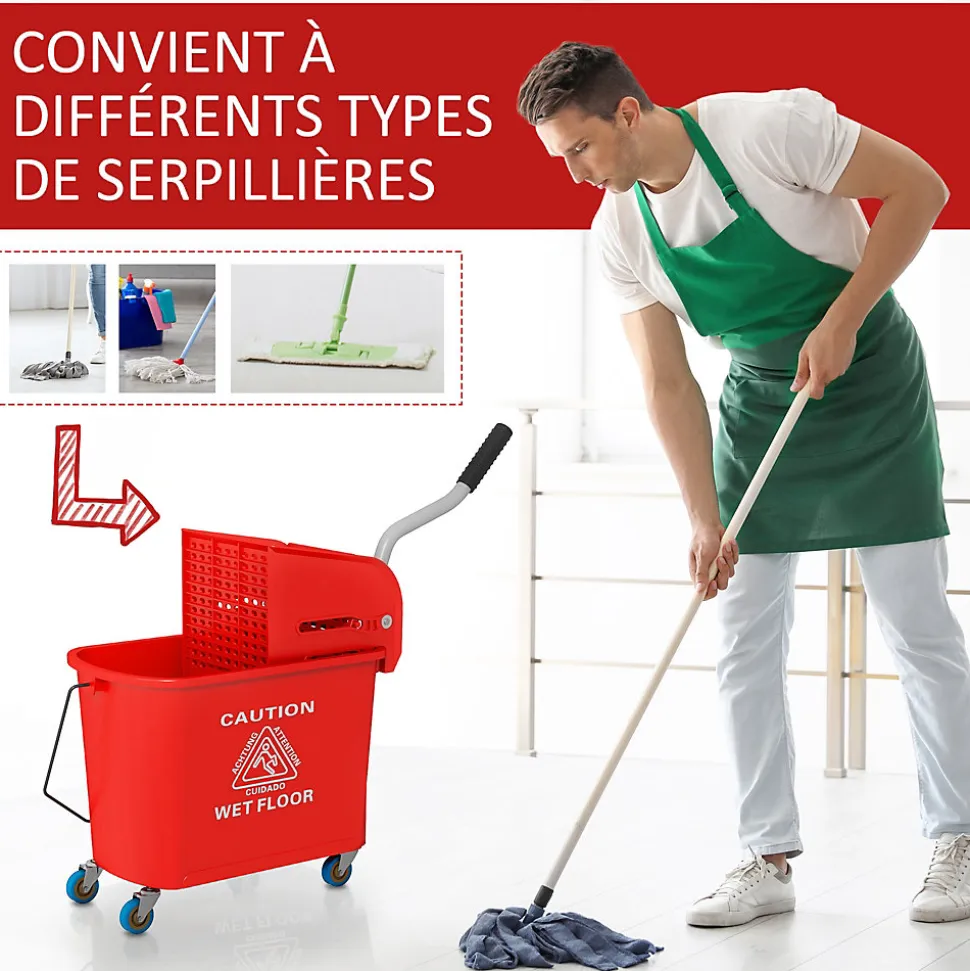 Ce chariot de nettoyage lavage sur roulettes vous facilitera grandement vos ménages ! Equipé d’un essoreur et d’un séparateur eau propre et sale, vous pourrez nettoyer vos sols avec une grande rapidité et efficacité.Caractéristiques :- Chariot de nettoyage lavage avec essoreur et séparateur d’eau- Grande capacité de contenance de 20 L- Facile à déplacer grâce à ses 4 roulettes et à sa poignée- Muni d’un manche pour le transporter facilement- Poignée robuste en acier inoxydable- Essoreur et séparateur d’eau amovibles pour un entretien facile- Montage et utilisation très facileSpécifications :- 4 coloris au choix : jaune, bleu, rouge, noir-Matériaux principaux : plastique PP et métal-Dimensions totales : 60L x 27l x 71H cm- Capacité de contenance max. : 20 L- Diamètre roulettes : 5 cm- Longueur manche poignée : 32 cm- Réf. : 720-002/002V00BU/002V00RD/002V00BK