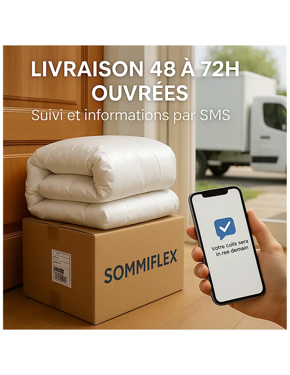 Couette chaude 220×240 cm – 550 g/m² Chaleur, douceur et confort pour des nuits paisibles toute l’année. ✔️ Dimensions généreuses Couette 220 x 240 cm, idéale pour lit double avec tombé élégant sur les côtés. ✔️ Garnissage chaud 550 g/m² Parfaite pour l’hiver ou les chambres peu chauffées. Chaleur homogène sans surchauffe. ✔️ Enveloppe microfibre haut de gamme Toucher peau de pêche, doux et soyeux. Sensation cocooning immédiate. ✔️ Respirante et thermorégulatrice Favorise la circulation de l’air pour éviter l’humidité et les réveils en sueur. ✔️ Hypoallergénique & anti-acariens Convient aux peaux sensibles et aux personnes allergiques. ✔️ Entretien facile Lavable en machine à 40°C. Séchage rapide, garde son gonflant lavage après lavage. ✔️ Livraison rapide 48/72h ouvrées Avec suivi par SMS. Produit soigneusement compressé pour un transport optimisé. Produit imaginé pour votre confort par SOMMIFLEX Literie de qualité – Conçue pour durer.