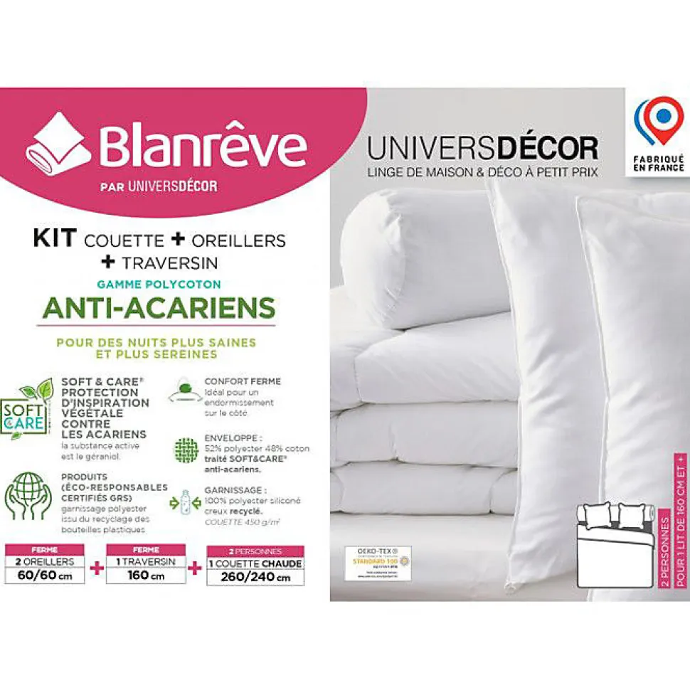 Couette très chaude 260 x 240 + 2 Oreillers 60 x 60 + Polochon 160 Polycoton « Confort » traité Anti Acarien Soft & care