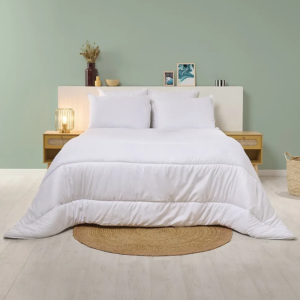 La Couette ANTI-ACARIENS – Couette Chaude 400g/m² – Traitement naturel anti-acarien et antibactéries La couette saine et anti-allergie Bleu Câlin a développé cette couette chaude bénéficiant d’un traitement naturel à base d’huile de lin. Grâce à ses propriétés anti‑acariens et antibactériennes, c’est la couette idéale pour les personnes souffrant d’allergie. Testée en laboratoire, elle est sans danger pour la santé et l’environnement, COMPOSITION : Garnissage 100% Polyester composé de fibres creuses siliconées. Enveloppe polyester 100% microfibre effet toucher peau de pêche. Traitement Naturel à base d’huile de lin : anti-acariens et antibactéries. Durable et résistant aux lavages. Ce produit bénéficie d’un traitement biocide. Principe actif huile de lin N° CAS : 8001-26-1. Conseil d’entretien : Lavable en machine à 40°. Produit de qualité : • Certifié de la norme OEKO-TEX Standard 100 – Testé pour les substances nocives. • Fabriqué en France dans nos usines dans le Nord de la France. Comment choisir sa couette ? : – 1 personne lit 90x190cm : 140x200cm (effet bord de lit) ou 200x200cm (effet tombant) – 2 personnes lit 140x190cm : 200x200cm (effet bord de lit) ou 240x220cm (standard – effet tombant) – 2 personnes lit 160x200cm : 240x220cm (effet bord de lit) ou 260x240cm (standard – effet tombant) Produit comportant au moins 70% de matières recyclées Produit totalement recyclable