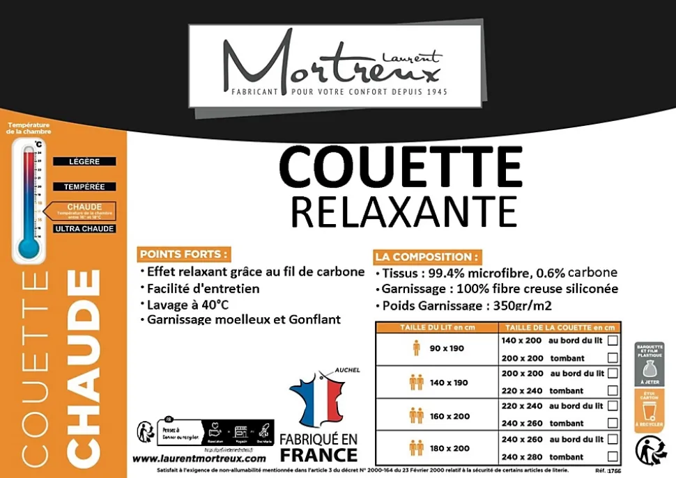 Couette relaxante – 2 personnes 220 x 240Tissu : 99.4% microfibre + 0.6% carboneGarnissage : 350g/m² de fibre creuse siliconéeCoins ronds – Double piquage – Biais polycoton couleurSon enveloppe de polyester microfibre inclut un tissage en fil decarbone qui décharge le corps de l’électricité statique et favorise ainsi l’endormissement.Vendue dans sa valisette de rangementFabrication française par MORTREUX SAS