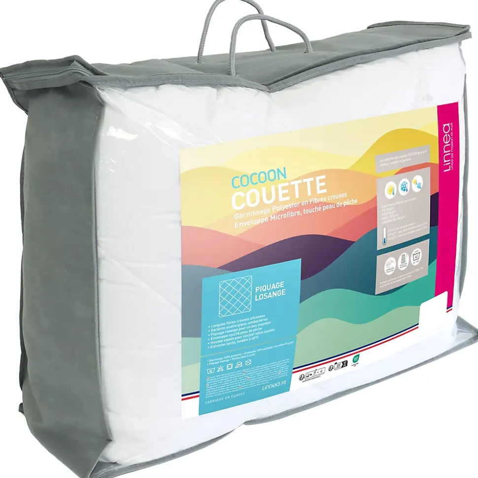 COUETTE COCOON 200×200 CM étéVous cherchez une couette légère, douce et respirante pour passer de bonnes nuits l’été ? La collection COCOON été avec son garnissage 100% fibre polyester en 200 g/m2 sera idéale pour passer vos nuits d’été.Notre couette été COCOON offre une respirabilité parfaite avec son enveloppe microfibre et un toucher peau de pêche très doux. Son garnissage léger en fibre creuse mais gonflant laisse passer l’air pour une régulation parfaite de la température et pour éviter toute transpiration.Couette garnissage 100% fibre polyester , enveloppe microfibre 100% polyester avec piquage losanges et contours soudure par ultrasons + housse de rangement. La collection COCOON est fabriquée en Europe.Côté technique :Matière enveloppe : 100% polyester microfibre 83 g/m2 toucher peau de pêcheGarnissage : 100% polyester fibre creuse siliconéeGrammage : 200 g/m2Indice de chaleur : Léger (été)Finition : piquage losanges et biais 4 côtésDimensions 200×200 cmPoids de l’ensemble ~1 620 gCouette vendue à l’unitéFabriqué en EuropeLes plus du produit :Belle couette, douce & respirante avec un garnissage en fibre polyester siliconée qui offre une durabilitée accrue.Finition piquage losanges pour un bon maintien du garnissage avec une enveloppe microfibre de qualité pour une longévité accrue de la couette.Livré dans une housse de rangement avec fermeture zippée pour stocker votre couette.Collection également disponible en couette de taille 140×200, 200×200, 240×220, 260×240, 280×240 et 300×240 cm. Articles vendus séparément.Quelle taille de couette choisir pour votre lit ?Le choix de la taille de votre couette dépend principalement des dimensions de votre lit et de vos préférences en matière de confort. Une couette adaptée garanti